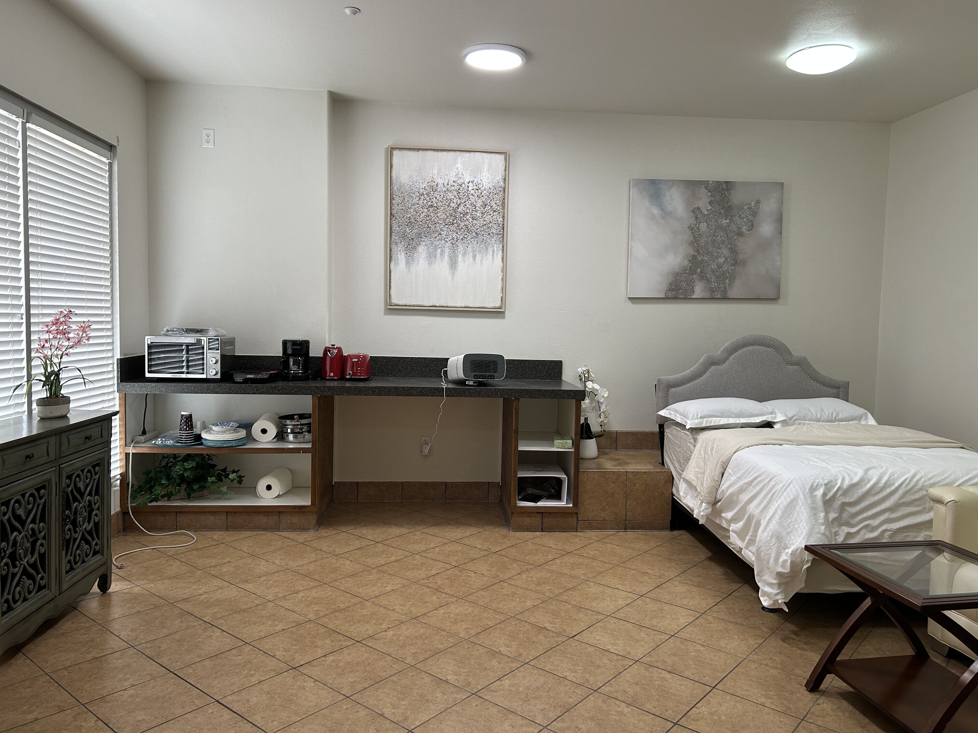 This is a large studio private back house with huge features: Vaulted wood ceilings, spacious granite kitchen/bar countertops, loft sleeping area with a/c, walk in closet, private patio with waterfall, private side patio, backyard garden, and unique foliage for a gorgeous tropical garden oasis. Only15-20 Min to Disneyland. Need more space? Our front house is listed as Tropical Paradise in Fullerton! They both have private areas and the gate can be unlocked to link both yards together if renting both properties.