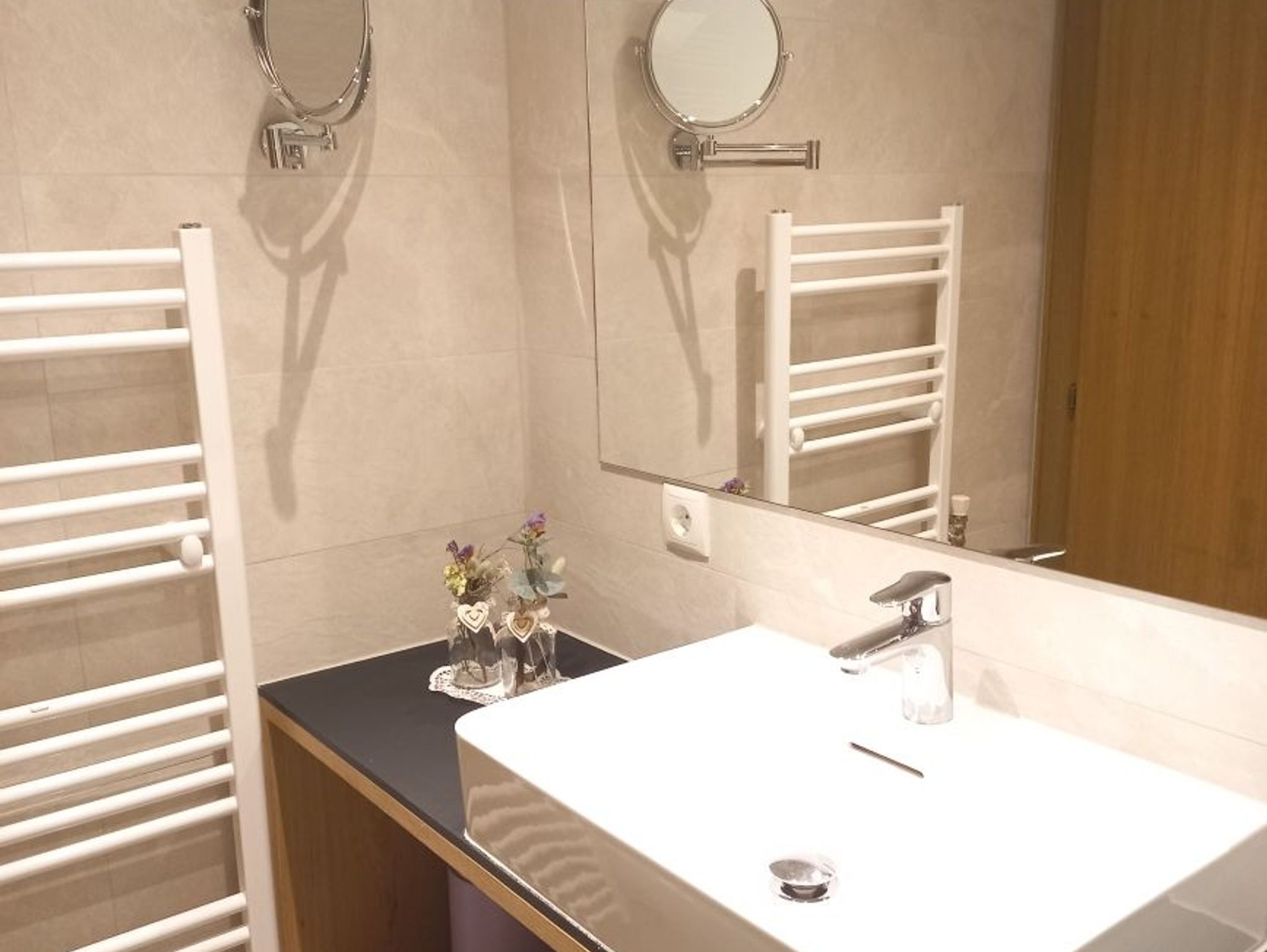 A holiday apartment on the ground floor with a separate entrance awaited you. The apartment has two bedrooms, a children's playroom, a bathroom with bathtub and washer-dryer , a wardrobe and an open living room with kitchen, dining table and a large couch. There are 3 TVs, one with a smart function and of course Wi-Fi. The apartment is fully heated underfloor and although located right next to the lift complex, it is quiet and you can relax wonderfully here.