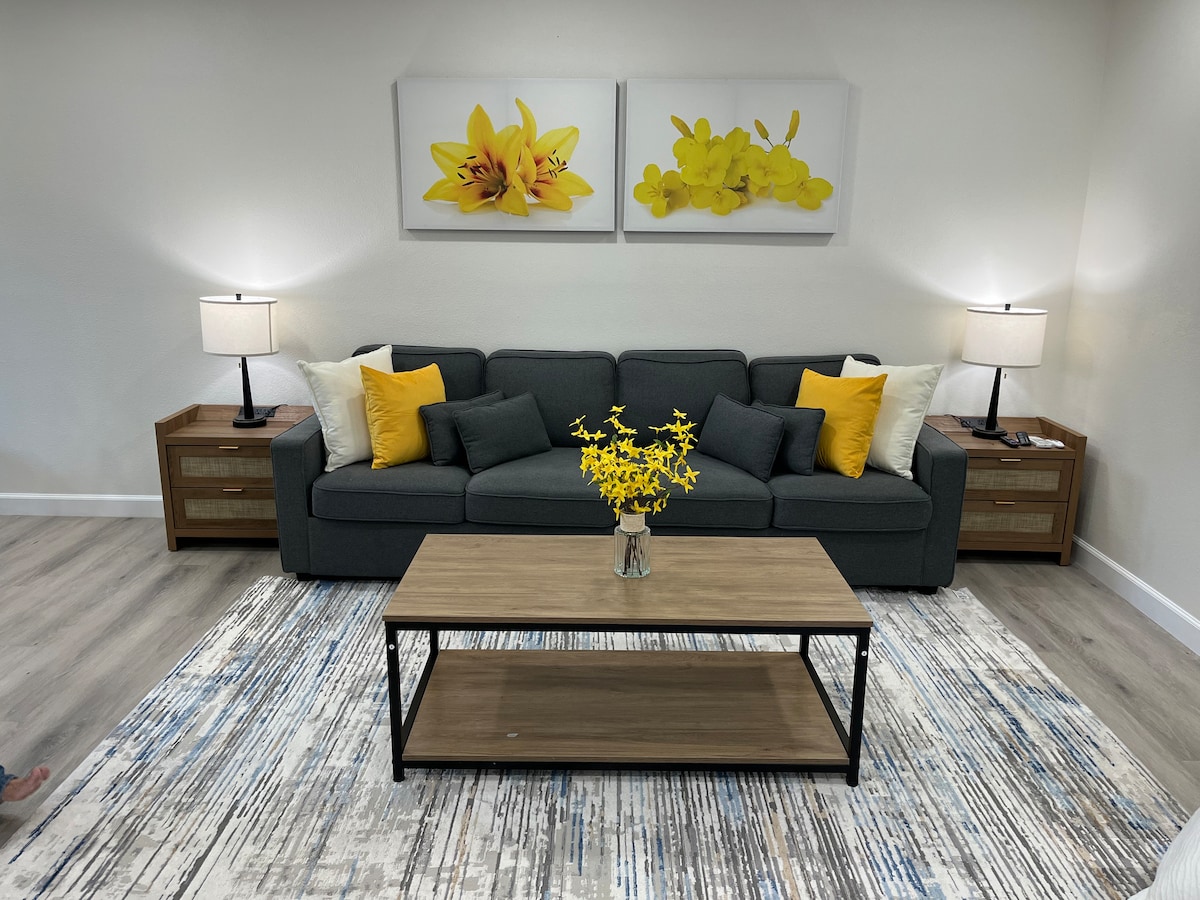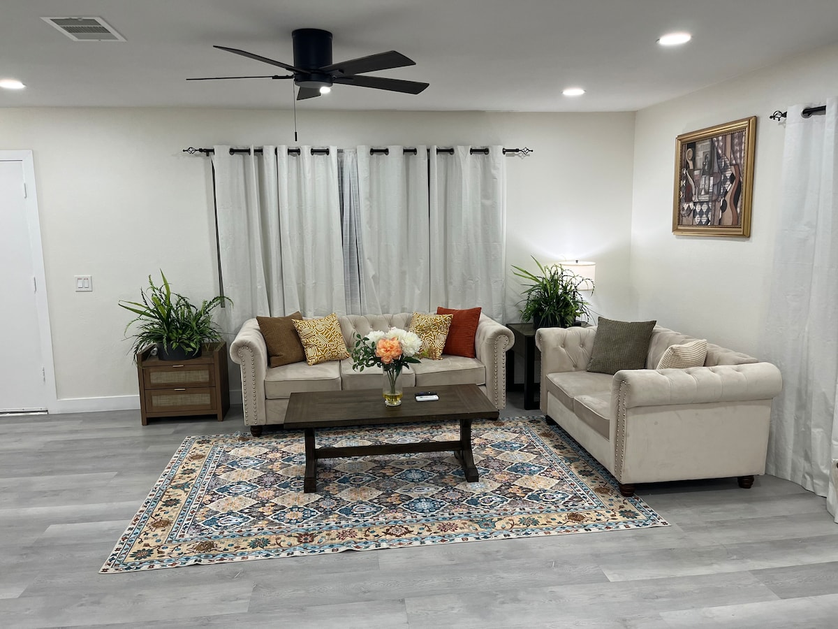 Our delightful attached studio home is a spacious open living space with a bathroom, thoughtfully designed to provide comfort and relaxation for families and a small group. The bright and airy living area is the ideal spot for unwinding after a day of excitement at Disneyland. Kick back on the couch while watching your favorite shows on the flat-screen TV, or have some quality time with your loved ones.