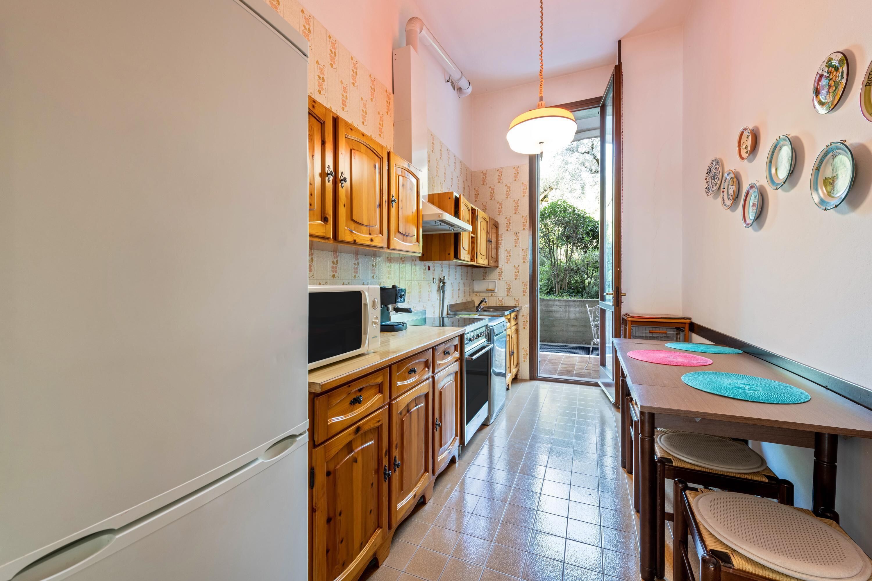 The apartment is composed, entering on the ground floor, of a large living room with leather sofa, TV, double bedroom also with TV, large wardrobe and a bathroom with shower, but the highlight is the exit from the kitchen, in a private garden oasis with a covered patio, equipped with a marble table, chairs, deck chairs to enjoy unique privacy and absolute relaxation
