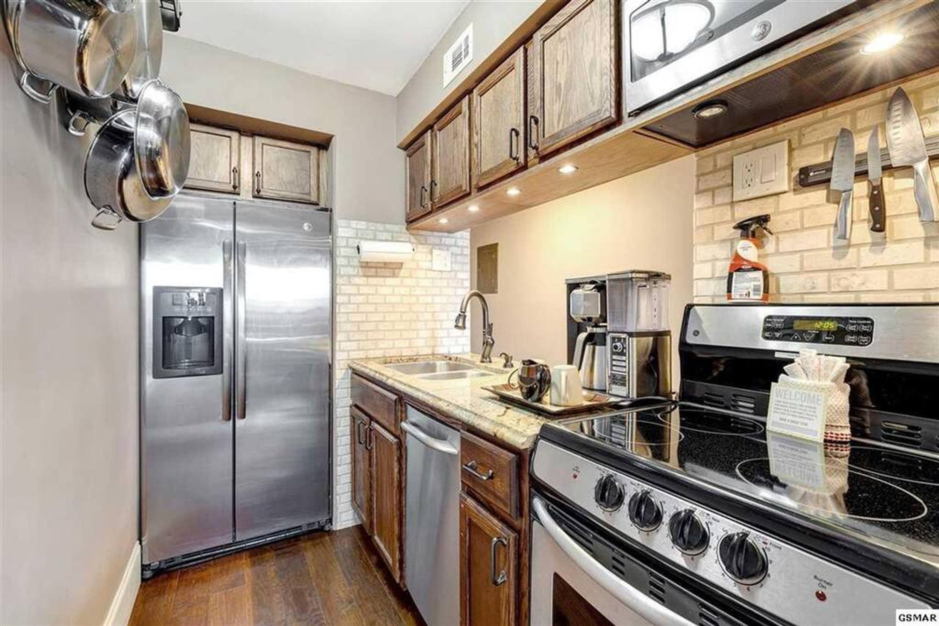 1 Bedroom 1 Bath renovated and updated condo on main floor with parking lot, has granite counter tops, Dishwasher, Convection/Microwave oven, coffee maker, refrigerator and freezer. Brand new beautiful kitchen and bath cabinetry. Enjoy the gas log fireplace in the living room during the winter months! This property is walking distance to downtown via stairs on back of building or via no step sidewalk in front of building along Cherokee Orchard. Walk to Anakeesta, The Aquarium, great restaurants and all the fun! OR CATCH THE FREE GATLINBURG TROLLEY JUST DOWN THE STREET at stop 45. Download the Gatlinburg Trolly App for schedules! There is a small convenience store in the entrance area that rents handicap scooters and has light convenience store items, check availabilty hours when you arrive. This unit is on the main floor with the parking lot, so there are no stairs of elevators needed to enter the unit. You will check in via door code.