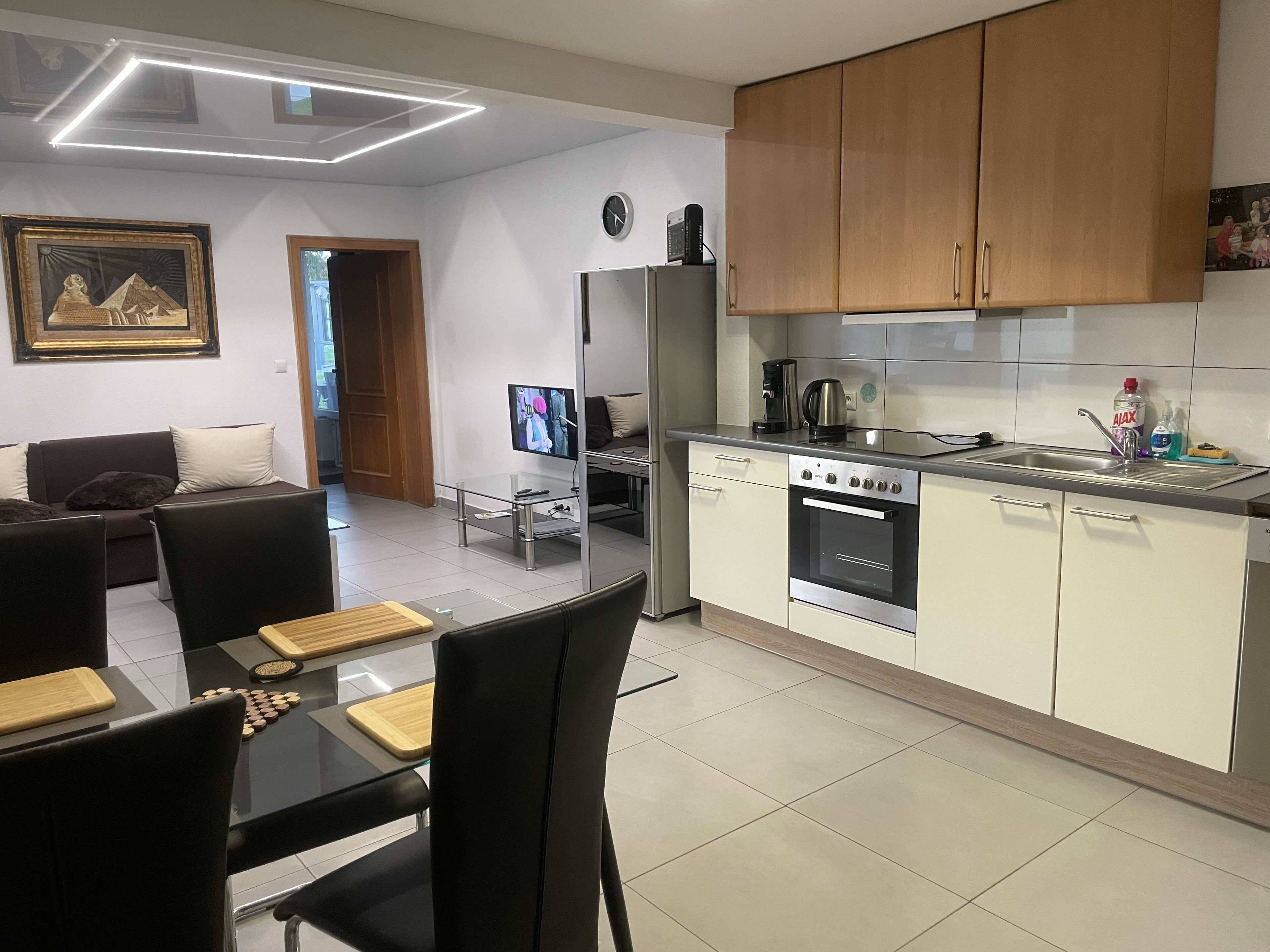 Our apartment 3 is located on the ground floor of our main house in Heinsberg. Via a private entrance you reach the spacious sleeping / dining area with well equipped kitchen. The way to the bathroom with shower leads to a storage room with washing machine, dryer and wardrobe.