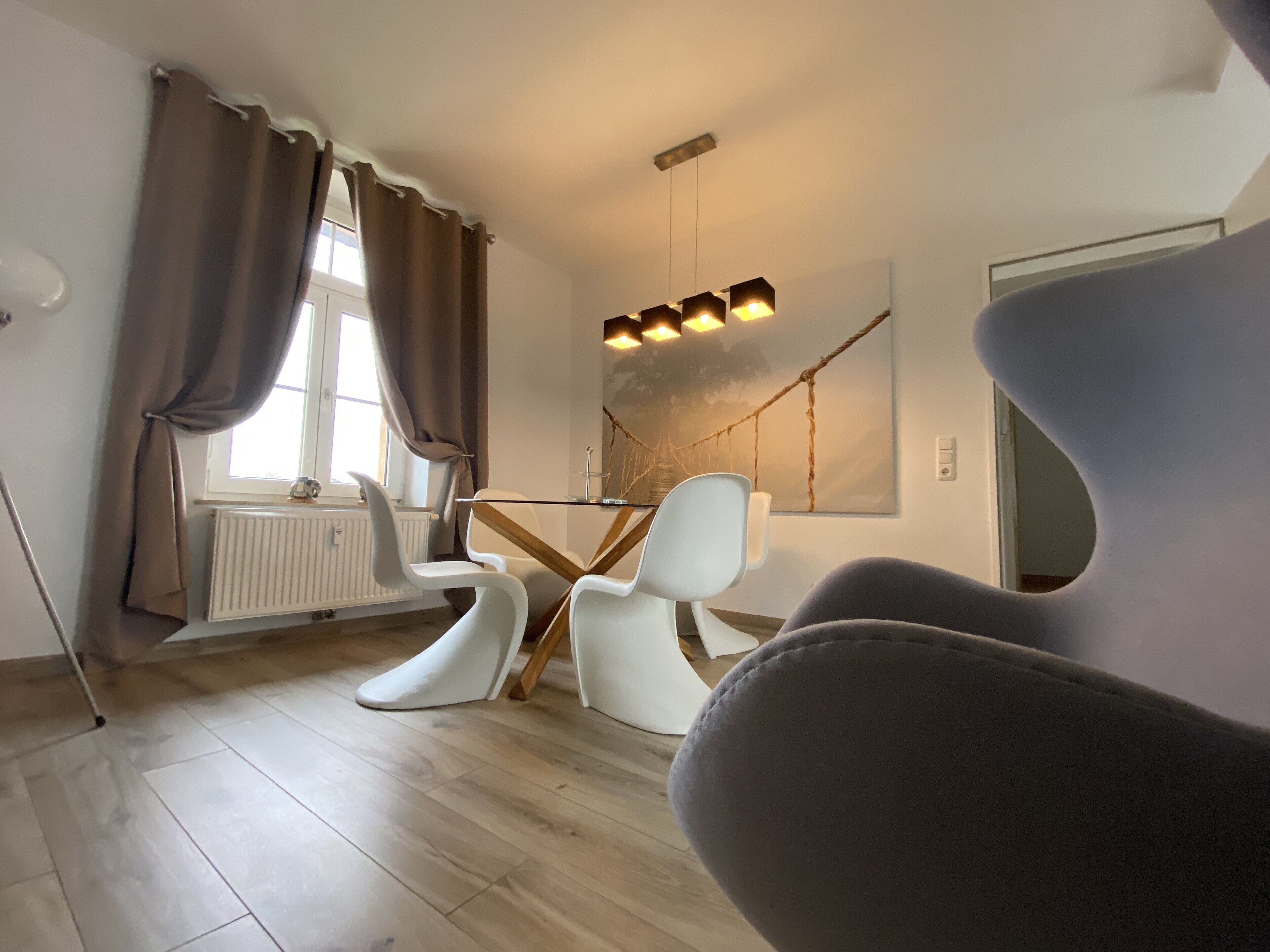 Our apartment 3a is located in the 1st. First floor of our main house in Heinsberg. An internal staircase leads to a spacious living / dining area with a fully equipped kitchen and access to the roof terrace. The bedroom as well as the daylight bathroom with washer and dryer impress with the modern character with decorative elements.