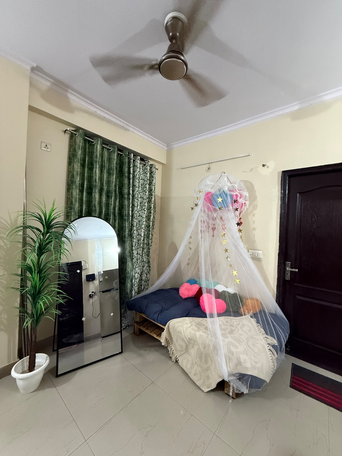 This 2BHK flat offers a peaceful, relaxing, and comfortable environment, perfect for seeking a pleasant stay. I, the host, reside in one room, while you’ll have exclusive access to an AC bedroom with a private attached bathroom, along with the kitchen, balcony, and hall.