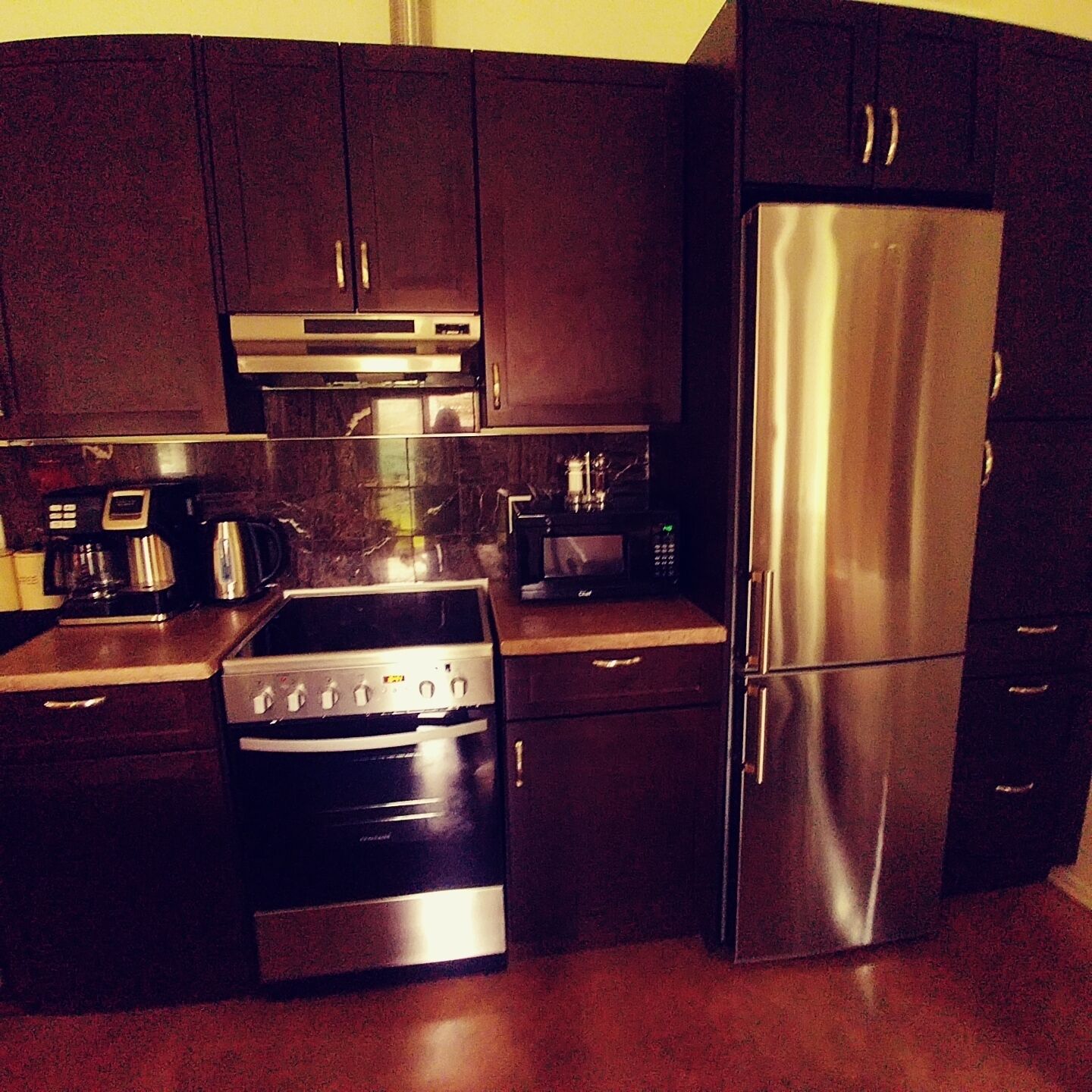 The loft has a bathroom with shower (no tub), a kitchen (no oven or hot plate), king bed, futon, work desk + chair, dining set, and a deck with two bistro sets. It has 10’ ceilings and is a large open space fully renovated with all brand new furniture within the last 3 years.
