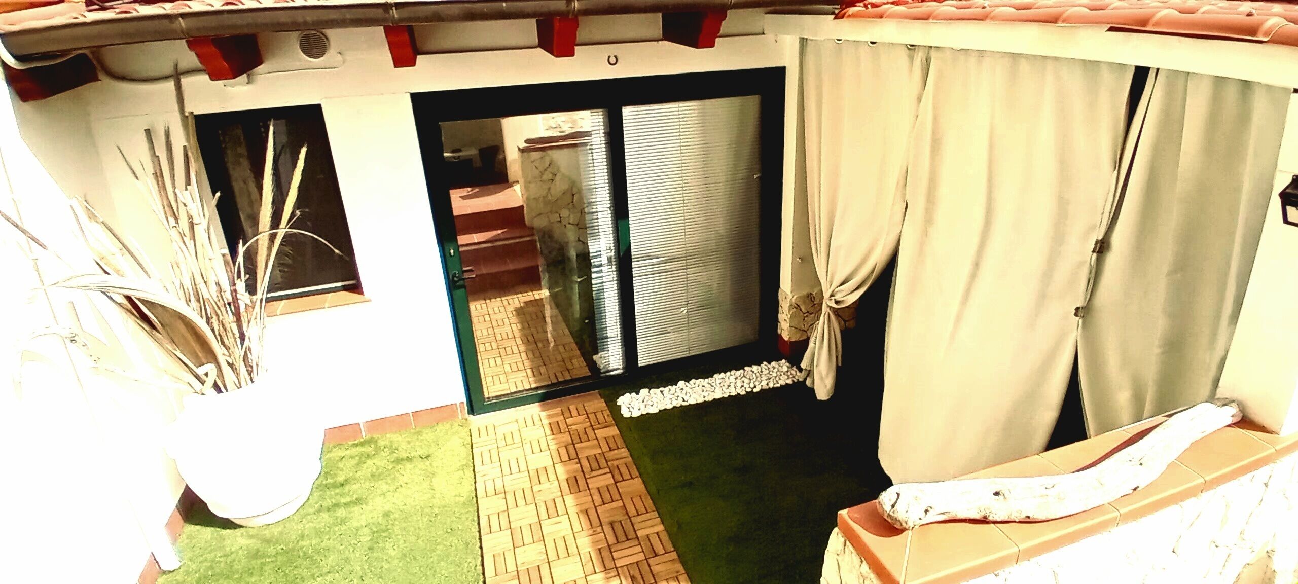 Entrance and courtyard with plants and flowers, in the exclusive veranda of the apartment, table and chairs for outdoor dining.