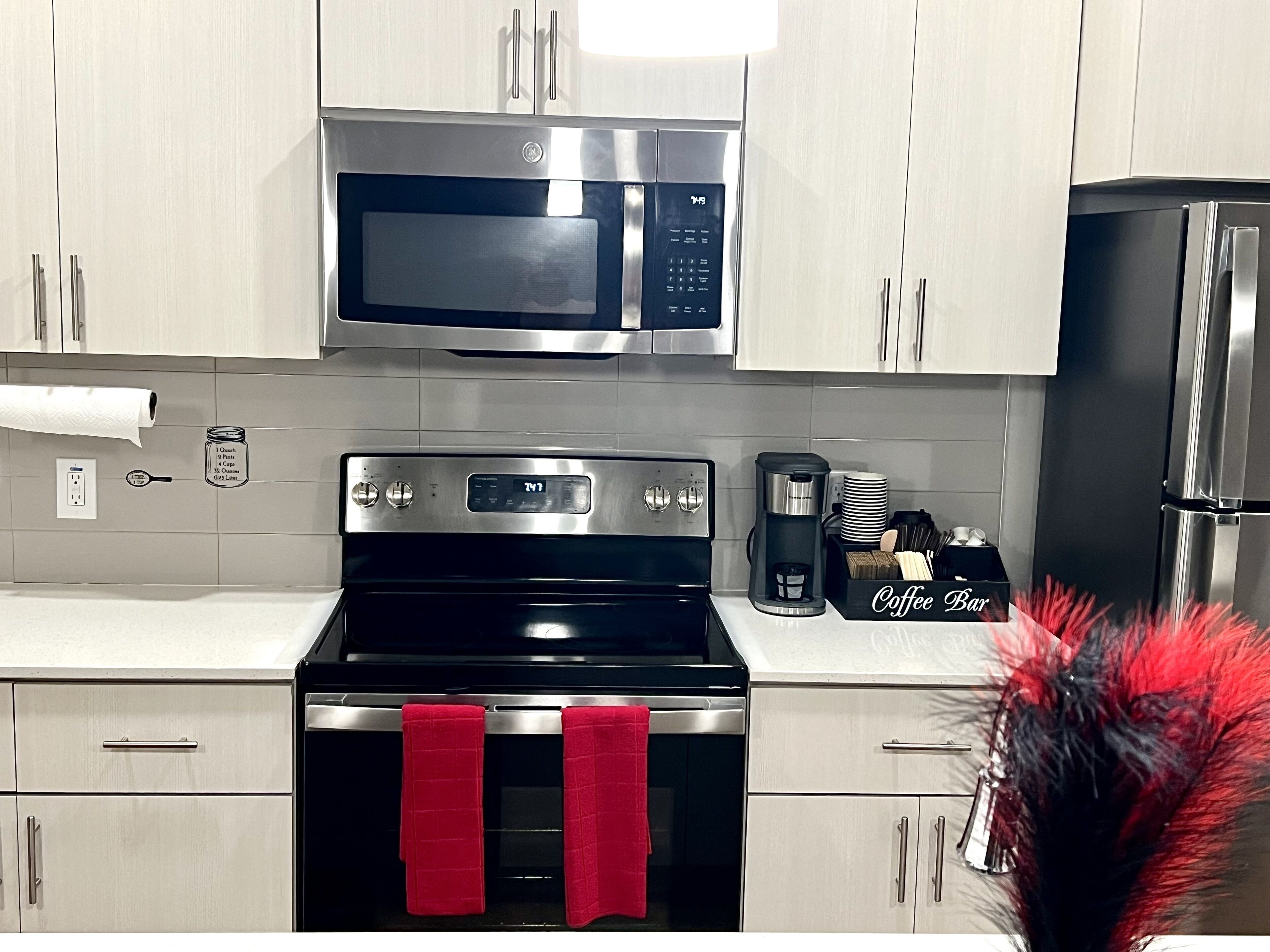 Your kitchen is fully equipped with everything from a toaster oven with air fryer, blender, Keurig coffee maker, dishwasher, electric stove/oven and microwave. Fully stocked kitchen with everything you need to prepare a meal or order takeout.