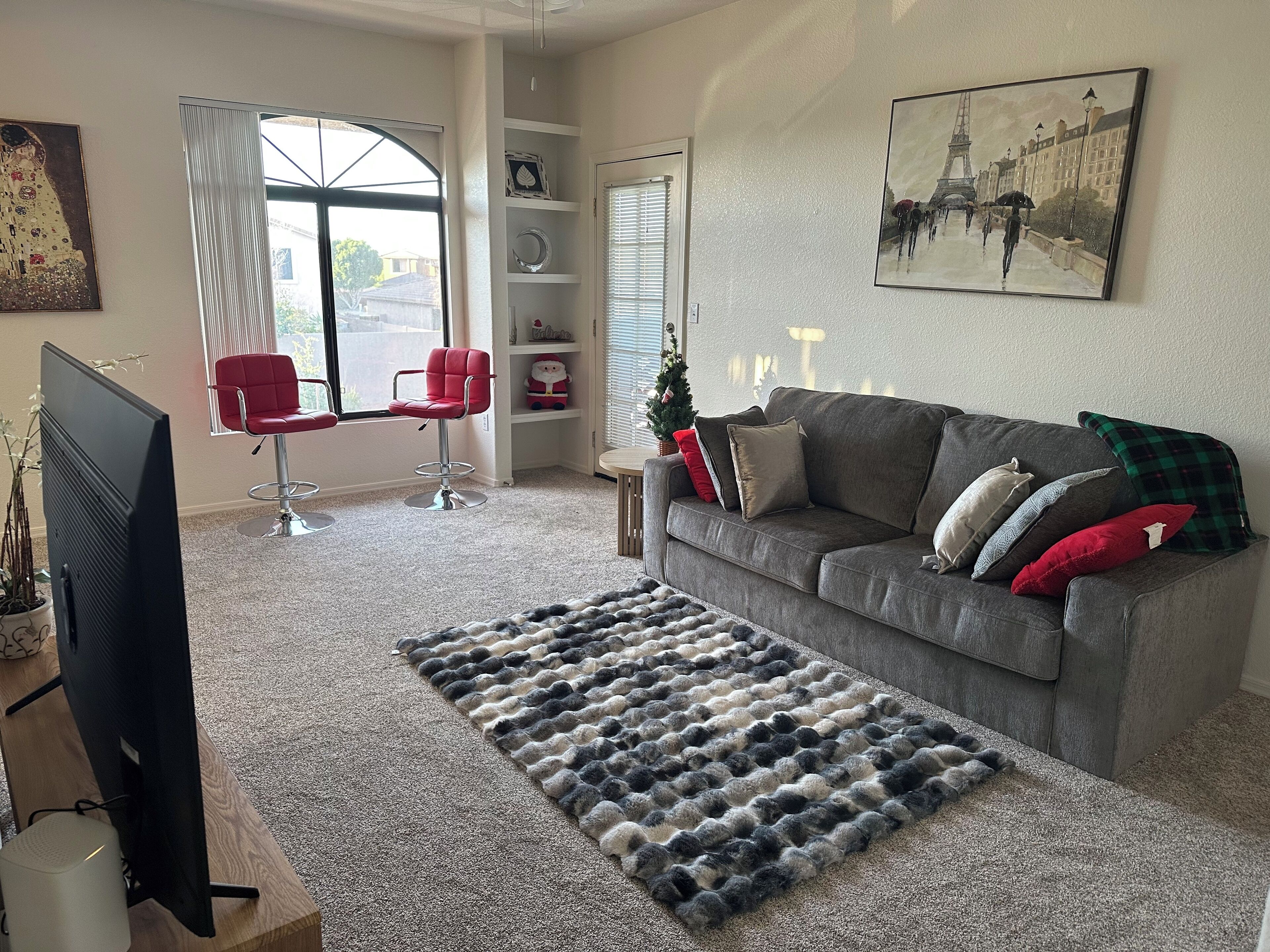 Kitchen, living room with big screen TV, queen bed in bedroom. Near baseball diamonds and several colleges. Easy access to State Farm Stadium