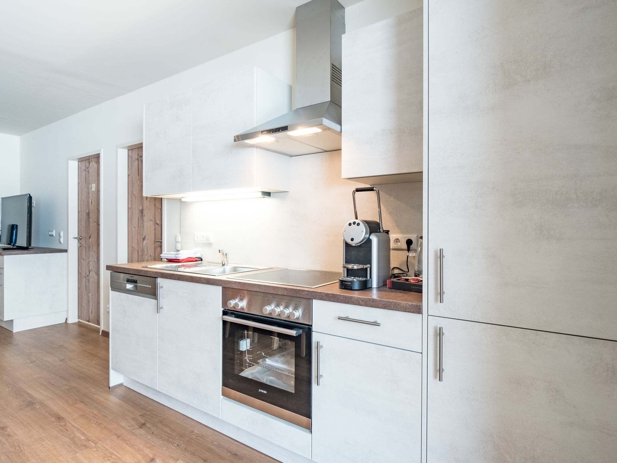 it's on the Vitalhotel. The room has top amenities such as Balcony, kitchenette with dishwasher, WiFi, cable TV, bathroom toilet, hairdryer, safe. The entire hotel area such as indoor pool, infrared cabins, sauna, relaxation room, fitness area, garden and bar can be used.