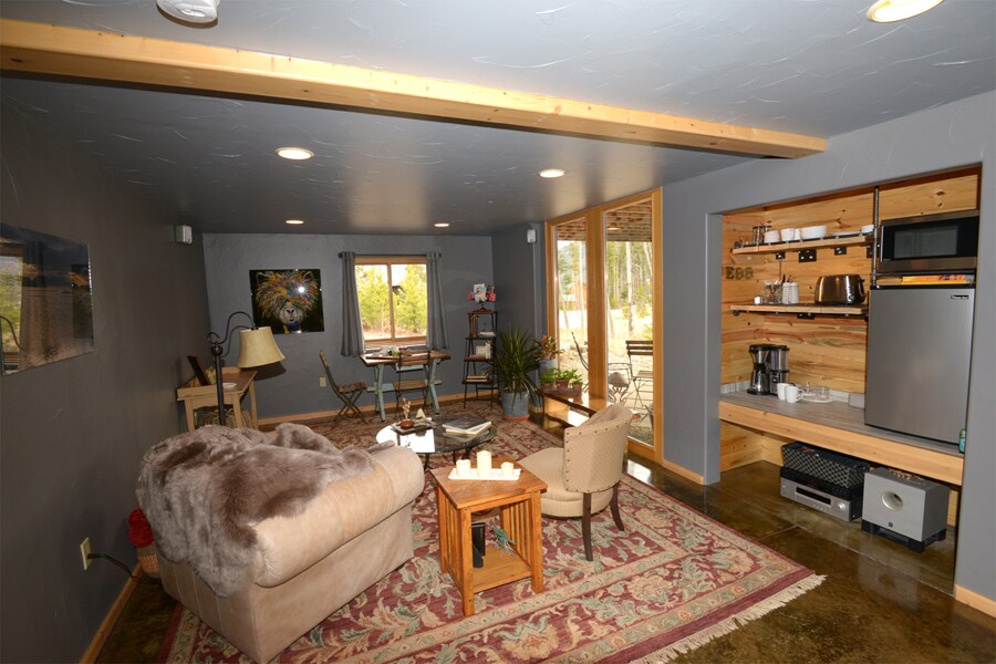 This space is not a private room but rather your own private guest quarters. It is a charming, cozy, and creative space that includes your own kitchenette, workout area, living area, bedroom, bathroom, and outdoor patio space to take in the view of Mt. Baldy. It is a 10 minute walk to the town of Grand Lake and just 2 miles from the entrance of the Rocky Mountain National Park. Not only do guests have access to a great space but they may also enjoy a campfire at night and use of a barbecue upon request. Wildlife is usually spotted in the early morning and as the sun is setting.