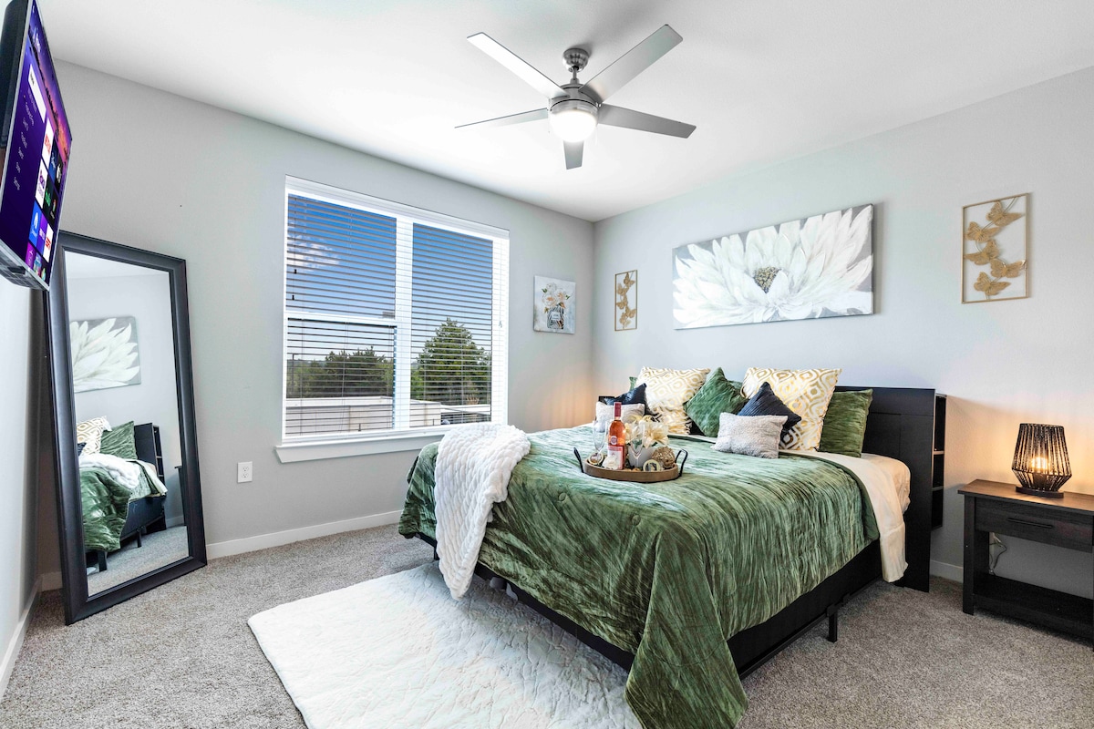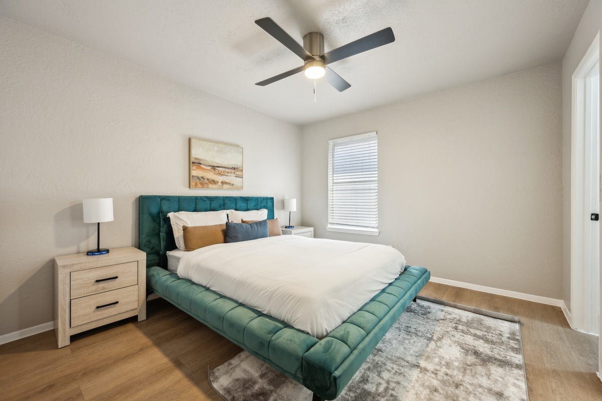 Rest easy in the cozy bedroom featuring a plush queen bed with soft linens and pillows for a perfect night's sleep.