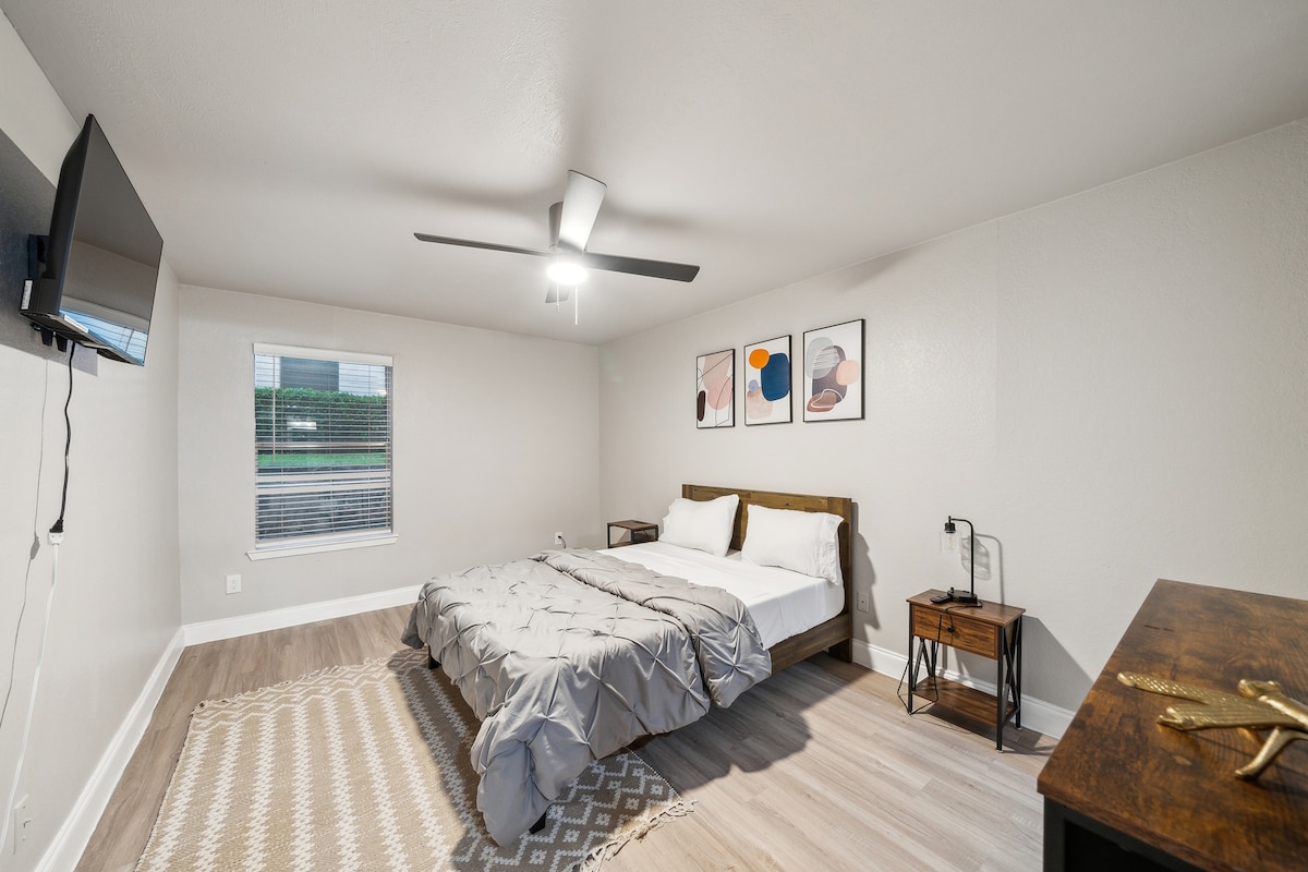 Our cozy 1BR apartment features a comfortable bedroom and bathroom. The bedroom features a comfortable king bed with fresh linens, a full length mirror and a smart TV for your entertainment.