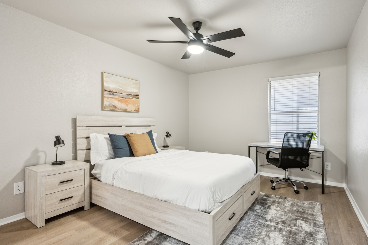 Comfortable... 1 Bed 1 Bath 754 sq. ft. spacious closets, ceiling fan; Specializing in long term stays for the business travelers and student relocation.