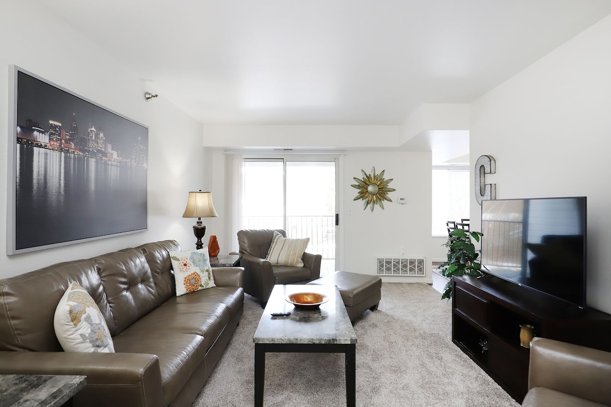 The living room offers an additional sleeping space with 1 full bed and 1 futon. Living spaces in this apartment are nothing short of inviting. With its smart TV, the living room becomes a perfect spot for relaxation and entertainment. Guests can also enjoy the convenience of amenities like heating, AC, WIFI, and a washing machine.