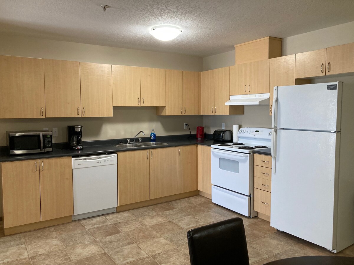 This roomy 2 bedroom, 2 bath condo comes with everything you'll need for a short or long stay in Grande Prairie. Fully equipped kitchen, bed linens, towels, balcony with propane bbq, full size washer and dryer and central AC. It also comes with onsite parking.