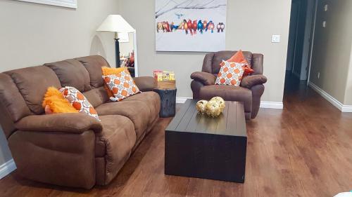 Open concept lower level suite with a nice sized bedroom, queen bed, large bathroom, Kitchen with a sitting bar to eat and open to the living room. Washer and dryer located in suite.