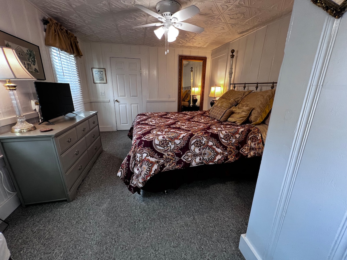 The light and airy bedroom features a queen size bed with oversized window facing the Two Room Inn and the historic Methodist Church. In winter and spring, you can look outside and see the town lit up with lights!