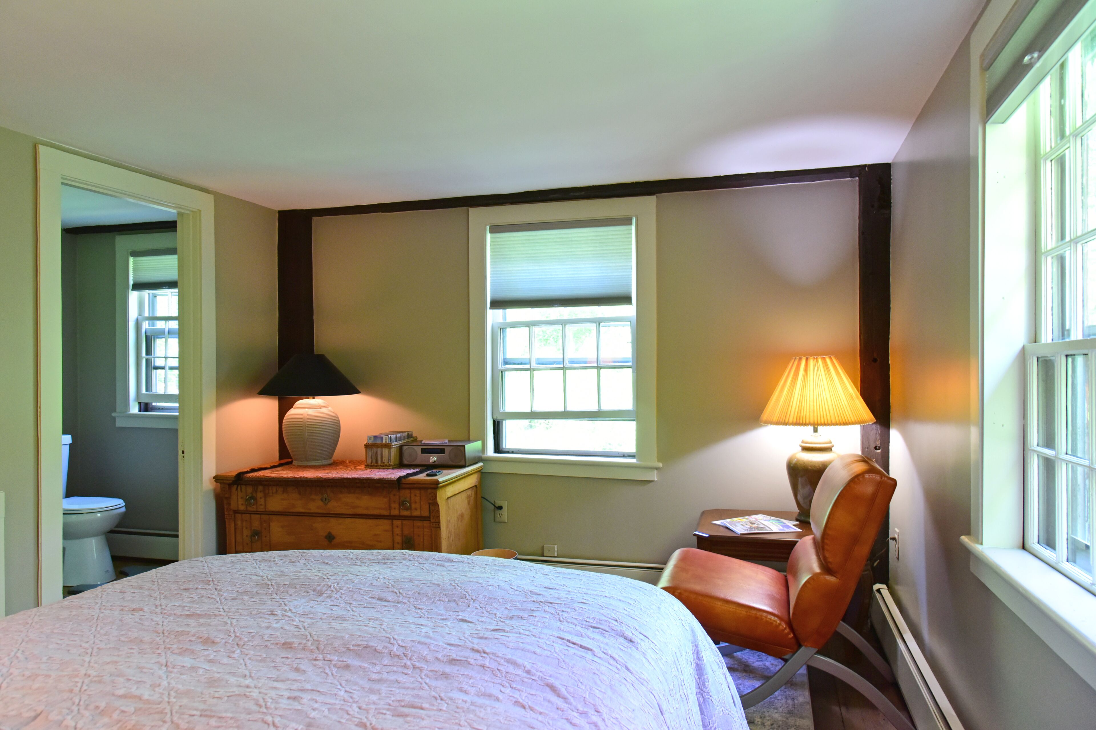 The room is light and airy with morning sun and the shade of the large front porch in the afternoon. This is a place to enjoy a meal or just lounge and relax with a view of the gardens and surrounding woods. This space features a private entrance, a kitchenette and full bathroom and very comfortable queen bed.