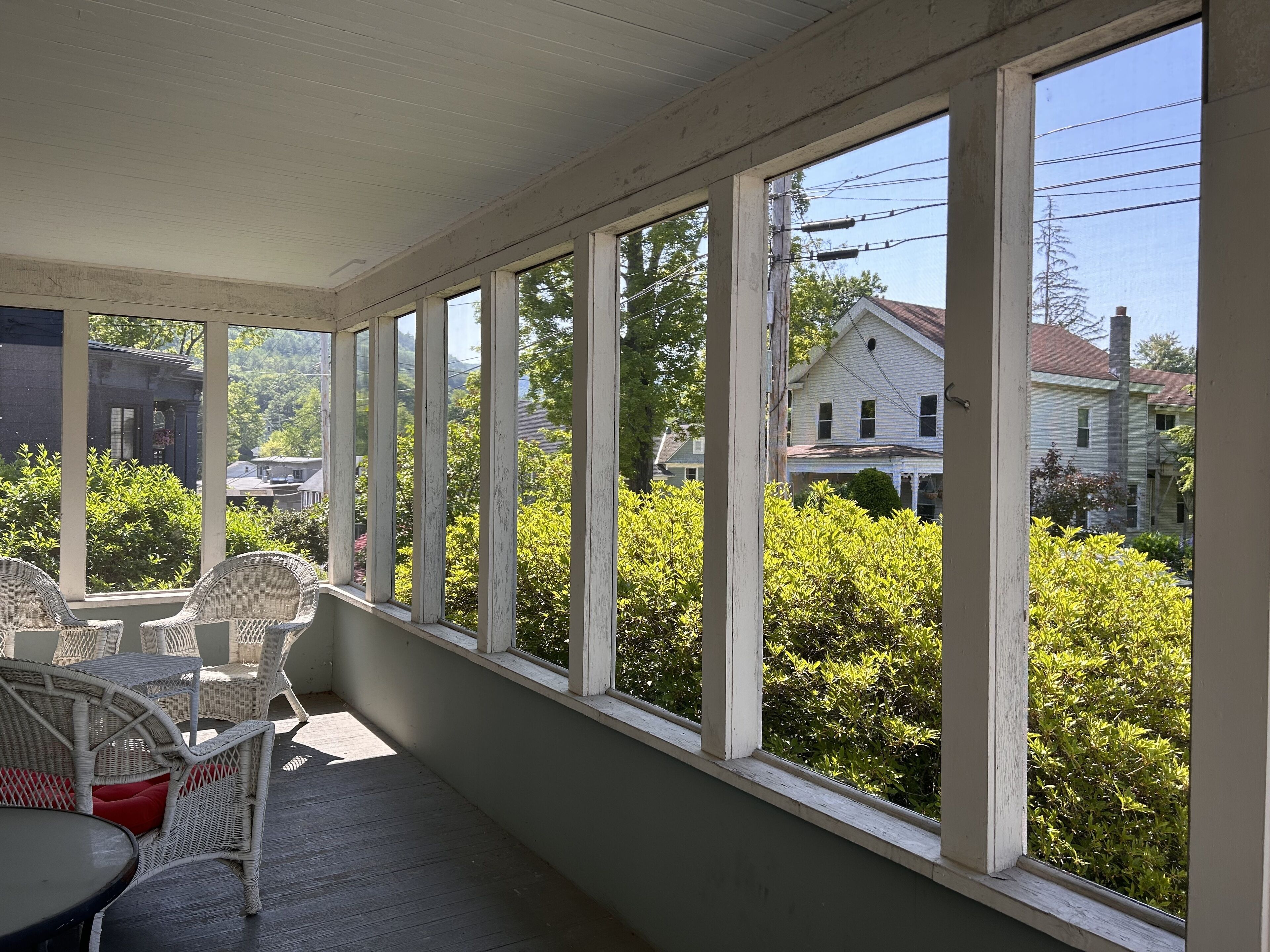 The large victorian porch is actually a garden room with views of colorful perennial beds, woods, and in three seasons a glimpse of the mountain range beyond - the perfect place to read, to talk, or just to relax and enjoy.