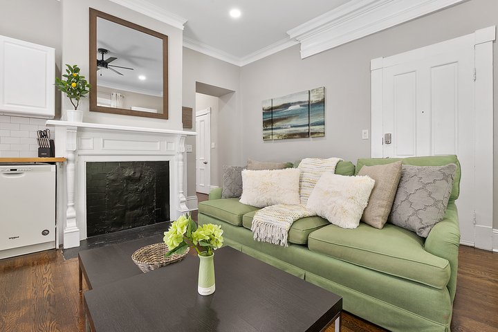 Enjoy beautiful Fisher Park just steps from downtown! This professionally decorated first floor apartment offers ultimate comfort with 1 bedroom featuring a premium mattress and smart TV for entertainment. Enjoy high-speed Wi-Fi, a fully stocked kitchen, office area, washer/dryer, complimentary on-site parking, beautiful front porch, charcoal grill, and more. A complimentary coffee/tea station adds extra convenience. With ample space, it's perfect for groups to relax and spread out comfortably.