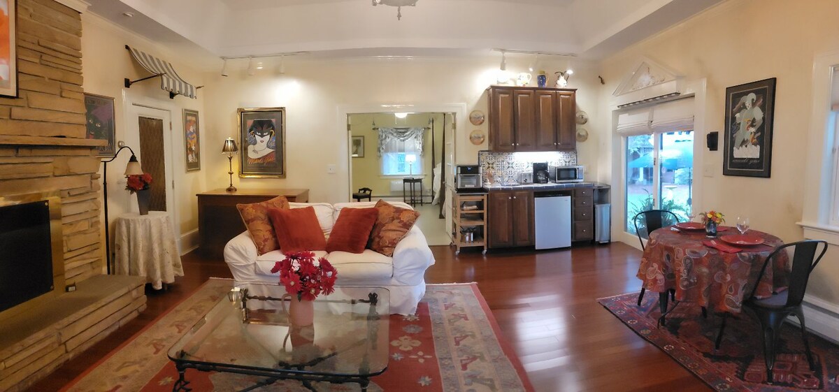It is outfitted with wi-fi, a queen-size bed, fluffy sofa, TV, fully-equipped kitchen with all utensils, coffee maker, full-size refrigerator/freezer and microwave. Complimentary coffee, tea and water. Large dining table and separate sunlit work space with large antique table. Full bathroom with shower. Towels, soap, shampoo, lotions and all linens provided. Street-side entrance with one flight of stairs to private door, right next door to the Turnage Theater.