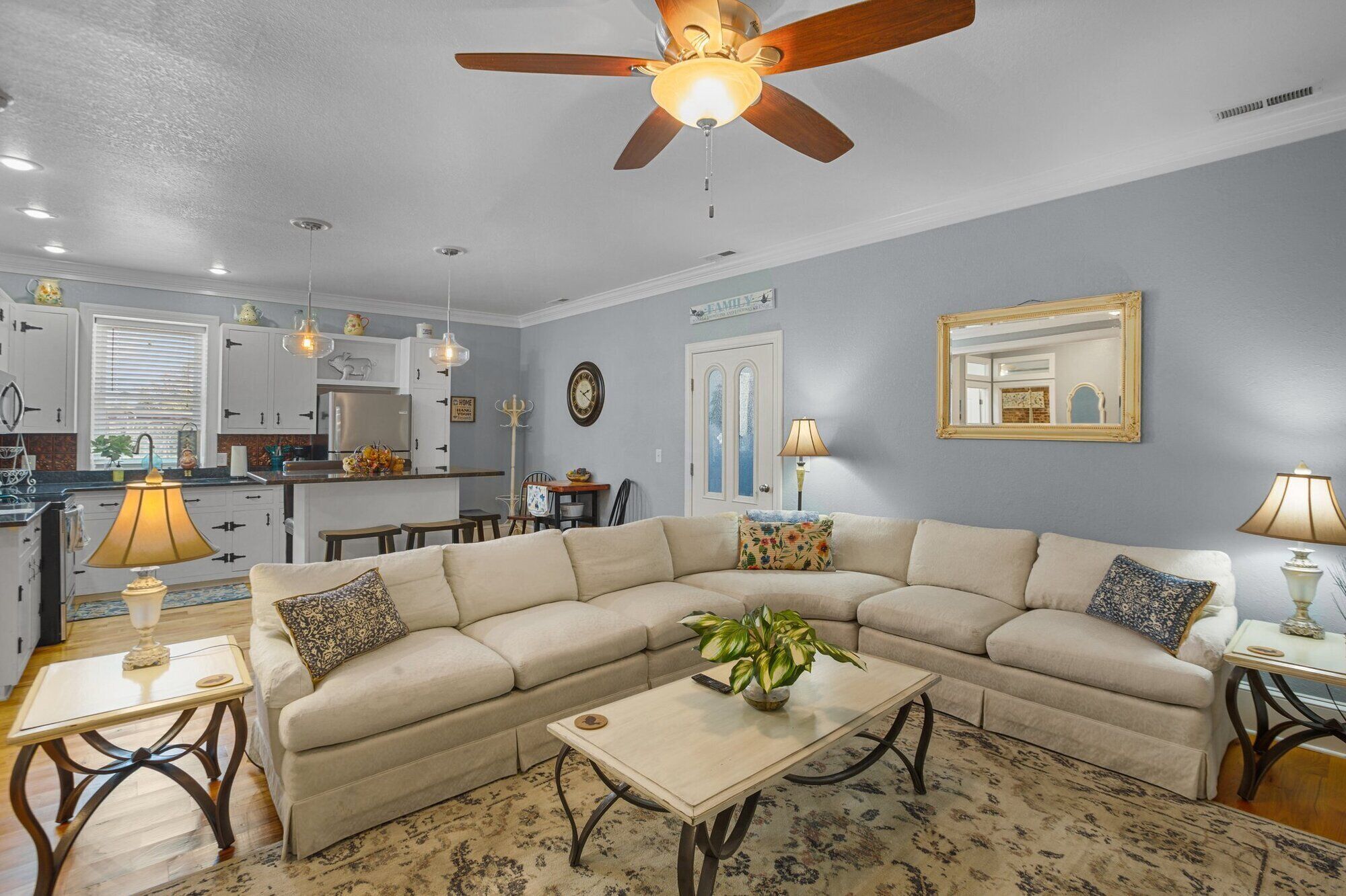 Fireplace mantels in the living room and hall bedrooms. Dining Area also in Living room and kitchen. Some original painted wood floors. Fully stocked kitchen with bar table and chairs, laundry room, sunroom/work area. Bedrooms are all spaced apart for privacy. Two of the bedrooms are just off each bathroom. All bedrooms and living room are equipped with smart TVs.