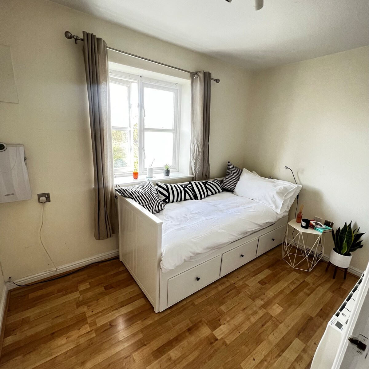 Cosy bedroom in a Victorian house with high ceiling. The room has large sash window with black out curtains. The room is in beautiful apartment close to bus stop. Short bus ride to mainline and tube. Central London, Stratford International and ExCel London centre 10min away.