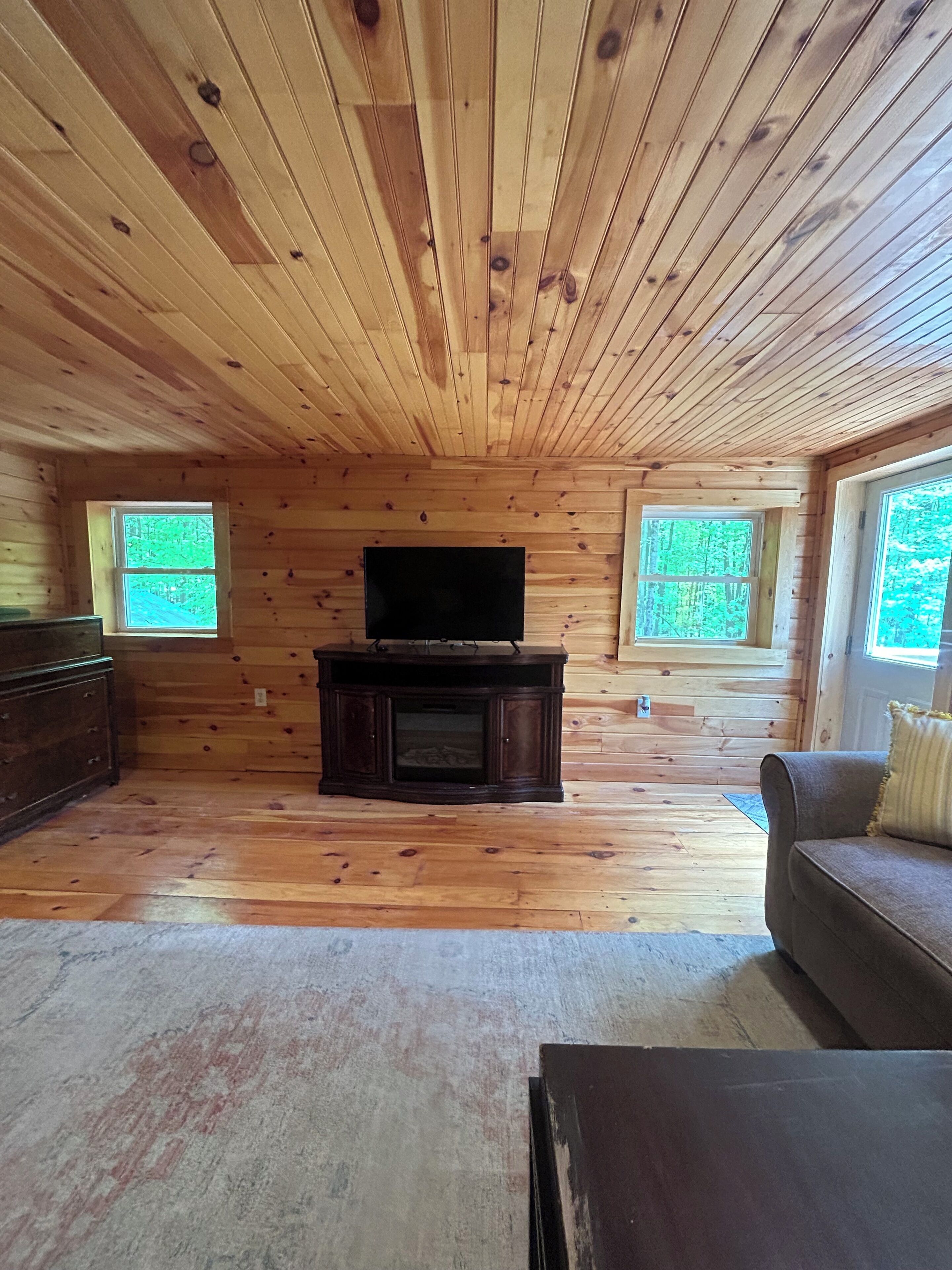The bedroom has a queen size bed. The living room has a large couch, which according to Grandpa Dan (our most frequent guest), is one of the best sleeping spots in the place with the propane fireplace as your nightlight! Not a pull out couch..but long and wide - a great twin bed. All beds come with bedding (sheets, pillows, and comforters).