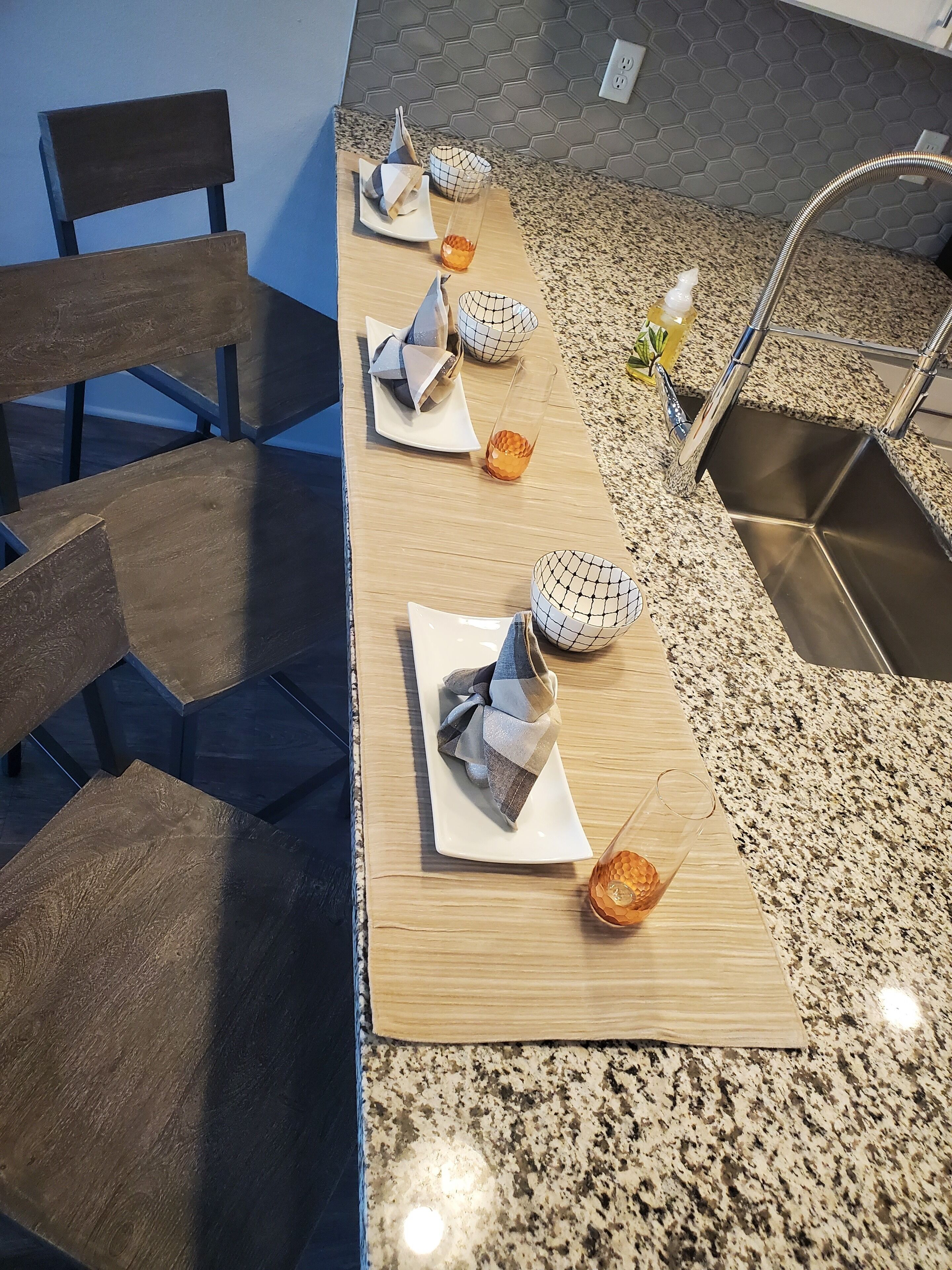 - "Was much better experience than staying at a hotel. Everything was great!" - "It was peaceful and clean. No detergent to wash the towels with and had to borrow from family" - "This is a first-floor 2-bedroom apartment in an attractive and well-maintained complex. It has a covered front area and a nice-sized covered patio on the back that overlooks a pond with a fountain. There are no outdoor chairs, but we had some with us. The two bedrooms and bathrooms are a nice size with large closets. We were a party of six adults. Two adults slept on separate air mattresses, which crowded the dining and living room areas. There are a full size washing machine and dryer. The dining table seats two. There is additional seating at the kitchen bar counter. I suggest the host refresh the equipment/dishes to ensure there are enough to prepare and serve a meal for six people. Overall, this was a comfortable, attractive unit best suited for four people."