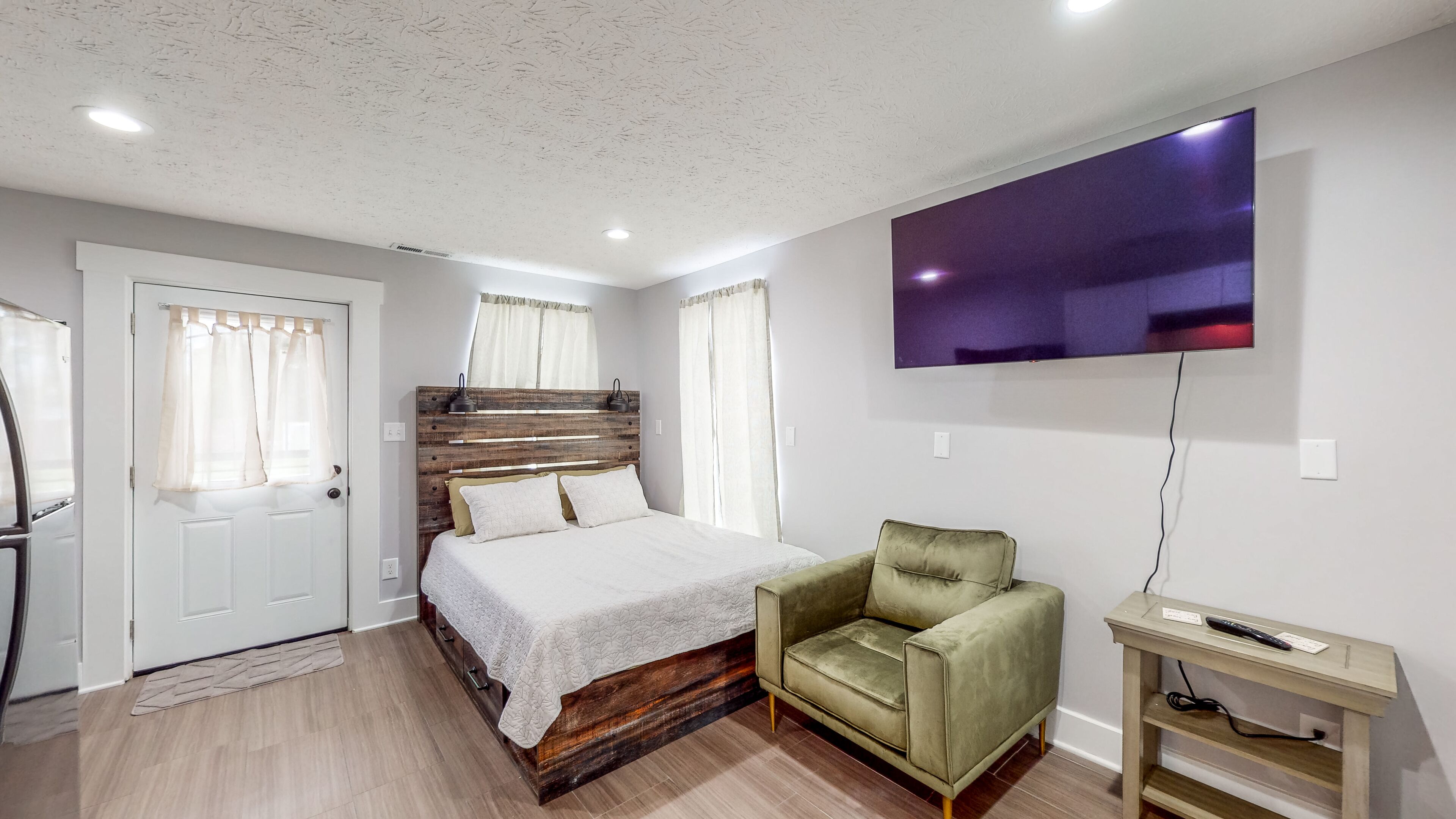 Sleeping arrangements: Queen size bed and a modular black chair lounger that pulls out as a twin bed. All Bedding provided. Smart TV (with all the apps) pulls away from the wall, faces any direction. Please use your sign-in for any apps used.