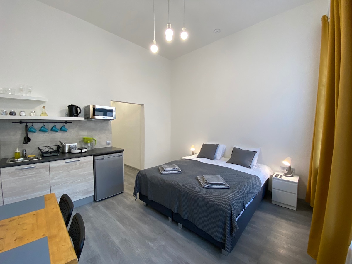 Квартира студия с современным дизайном is situated in Grodno. Complimentary WiFi is provided throughout the property. This apartment features 1 bedroom, a satellite flat-screen TV, a dining area, and a kitchen with a microwave and a fridge. Towels and bed linen are available. Druskininkai is 45 km from the apartment, while Sokółka is 36 km from the property.