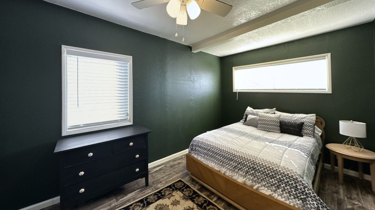 This suite in secluded in the back of the property giving the guests their own private entrance. Guests have access to a comfy queen sized bed, flat screen smart tv, full bathroom and reading area.