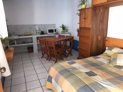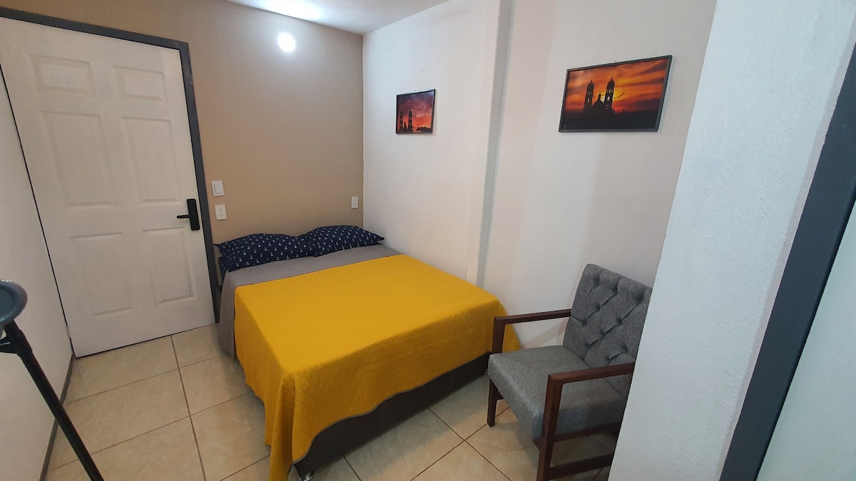 Cute, comfortable, and convenient one-bedroom mini apartment. Double bed, a kitchenette with a tarja and electric induction iron. Kitchen utensils, closet, closet, bench, secretory chair, desk, refrigerator, blender, microwave, microwave, dedicated private bathroom Huesped, dedicated bathroom Huesped, fan. Close to UAG ICB, near Colomos Park, and Revolution Sports Unit, parks, wooded camels with walkers, super markets, convenience stores, pharmacies, restaurants, coffee shops etc.