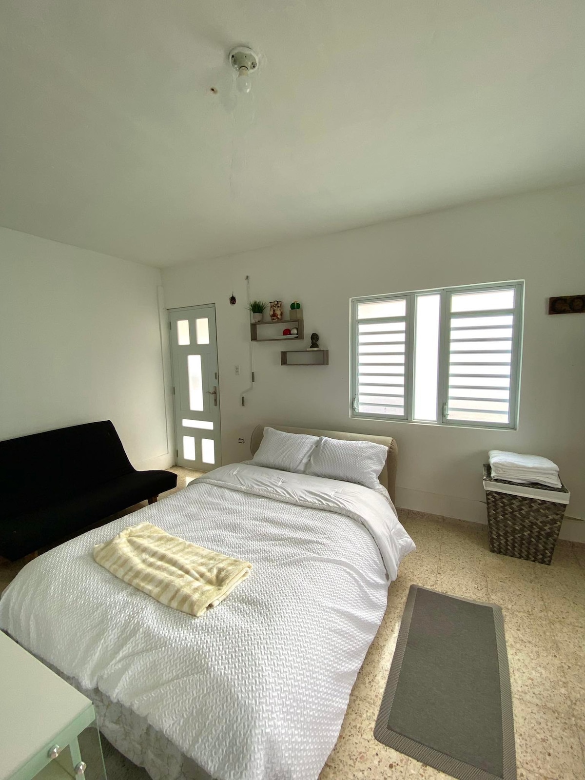 1 bedroom apartment located near main avenues in quiet neighborhood in Guaynabo. Separate entrance and several amenities available, including: air conditioning, bathroom, refrigerator, 2-burner stove, wifi, towels, hot water, coffee, and bottled water. Great for working, studying, and taking a break. Apartamento has a queen bed, a sofa bed and a desk. Parking on the avenue or in front of the property, if available.