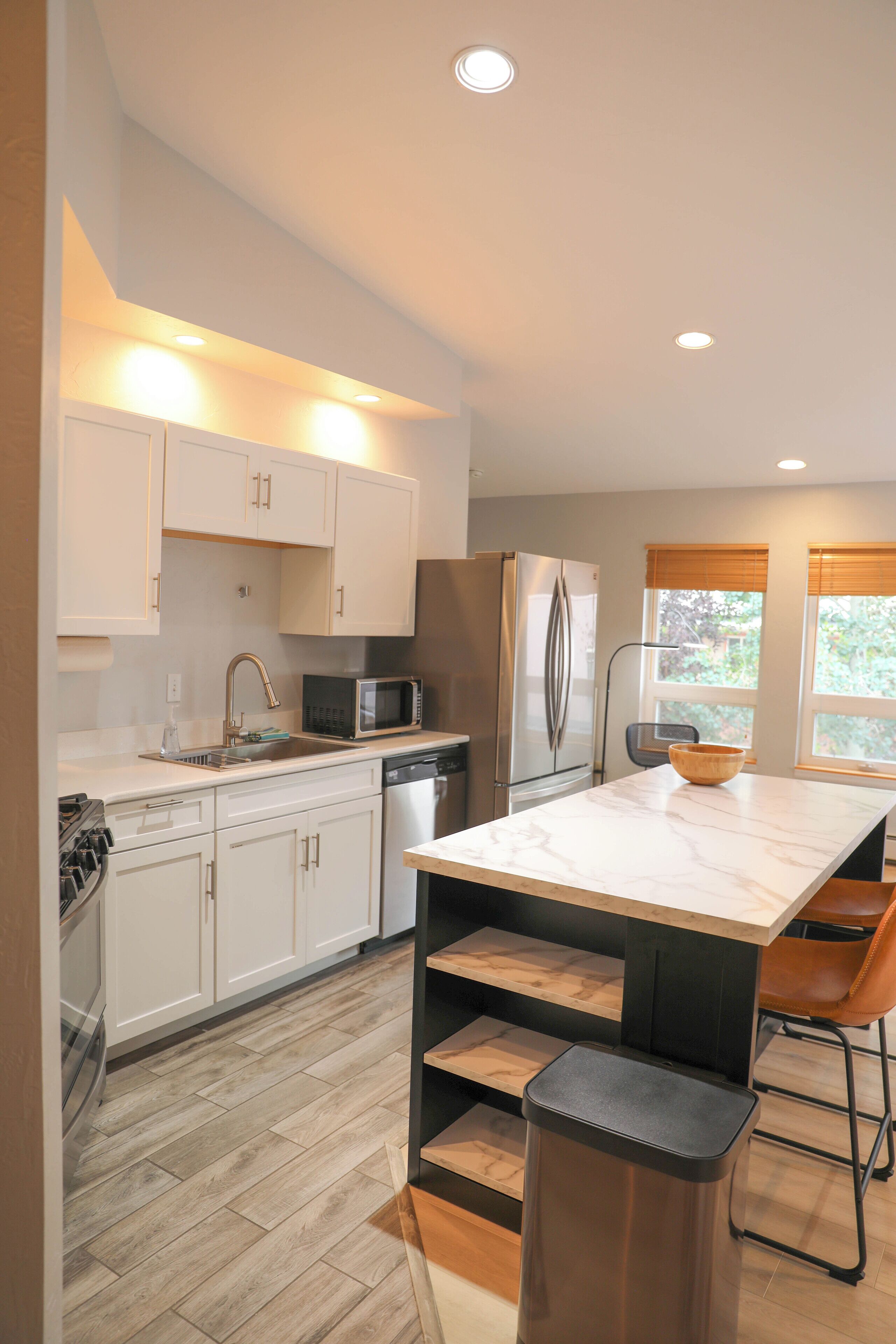 Our goal is for you to feel right at home in our guest apartment! You will find a fully equipped kitchen with seating for four around the peninsula. The open concept layout makes it nice to enjoy the company of those you're with while cooking and unwinding. The outdoor deck located off the kitchen is equipped with a gas grill. Other amenities include a full-size washer and dryer, heated floors for your comfort in the cold months, internet and a ROKU television to access your favorite internet channels (no network tv though).