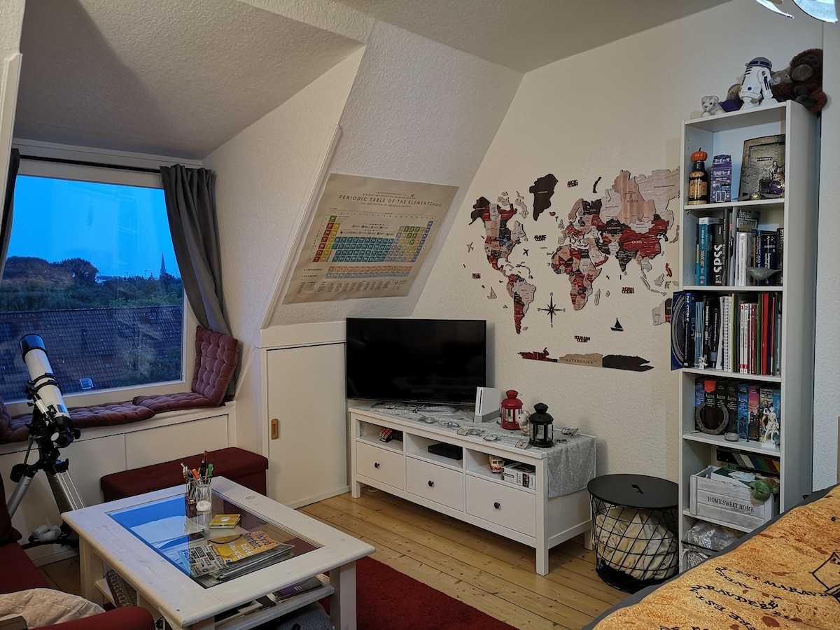 The room itself has about 23m² and is fully furnished with a large bed including 1x bedding, desk, wardrobe, TV and living room table, various shelves, as well as a sofa bed for guests. The highlight is the window sill where you can sit well and watch the Hamburg skyline, including the five church towers and the Elbphilharmonie. The kitchen is fully equipped with a stove, oven, refrigerator, dishwasher and washer. Since the apartment was completely renovated before moving in, the bathroom is also in modern condition, including a towel dryer.