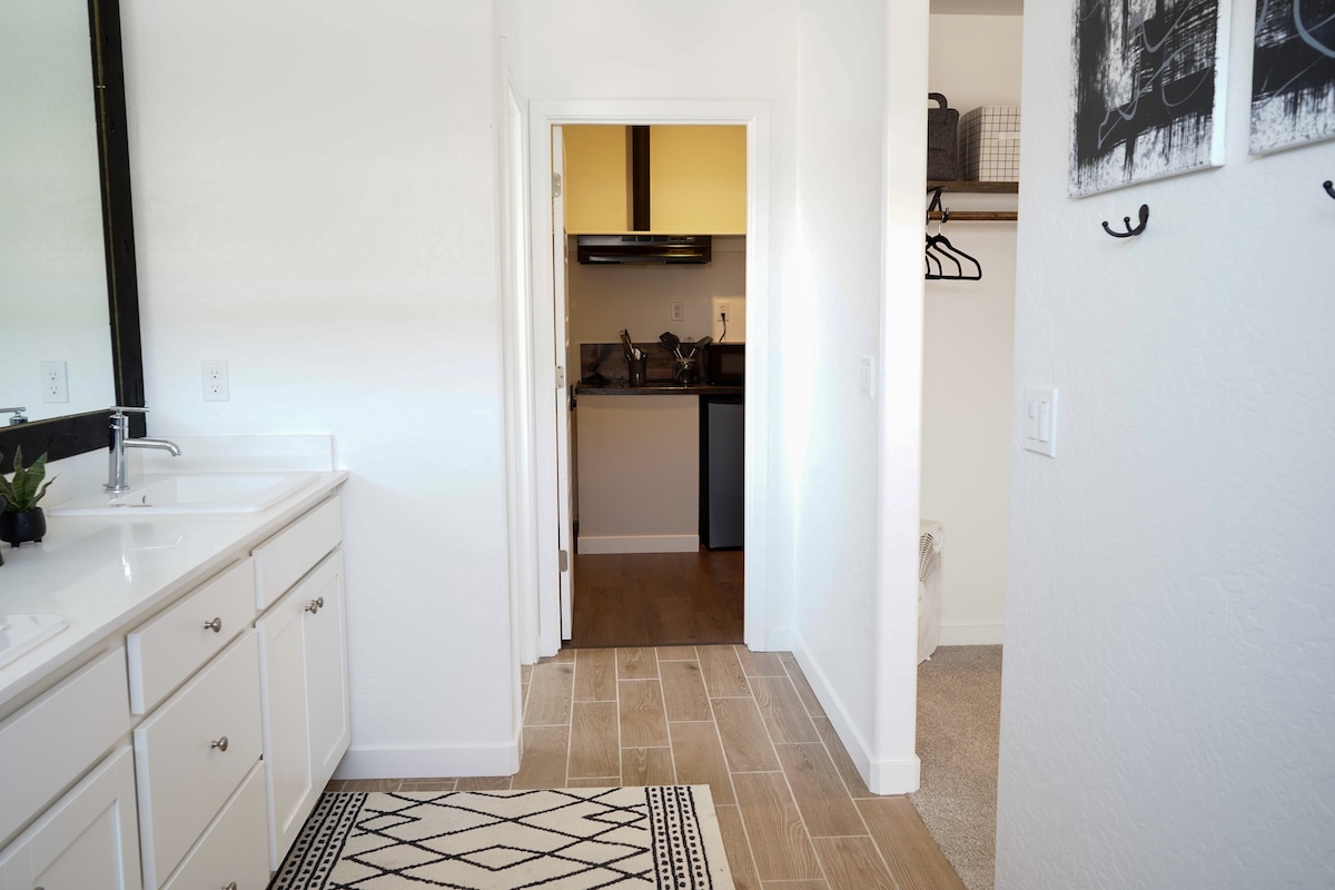 Executive studio (15 min from Leemoore NAS) for military, (5 min from Adventist Hanford) Private entry lobby access, full kitchen (dishware/utensils), towels, large bath (his/hers sinks, walk-in shower). Iron/board, free high-speed WiFi, all utilities included, security monitored, on-site free parking. Centrally located, peaceful new build. Keyless self-check-in. Your home away from home!