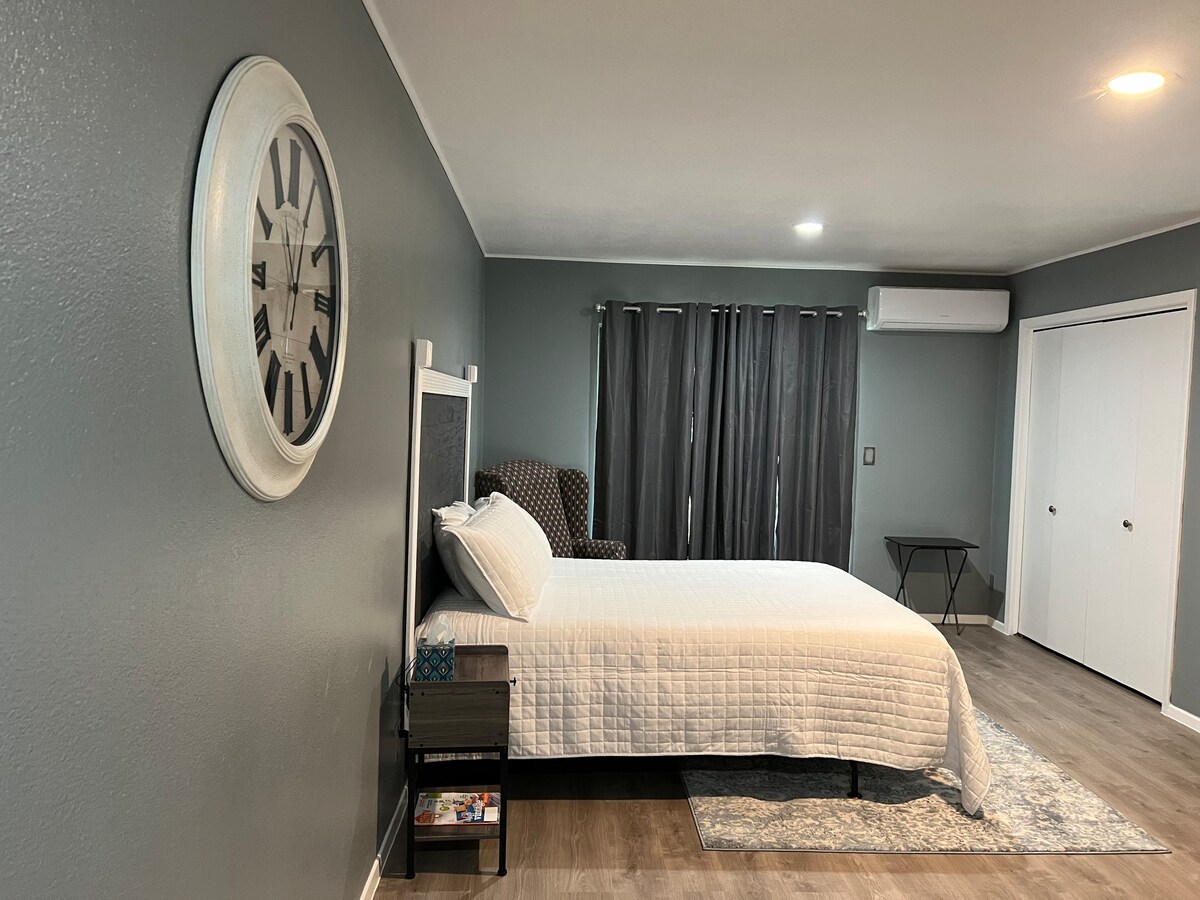 Get ready to relax in this cozy studio in Harlingen. This beautiful unit features 1 queen bed, WiFi and streaming TV’s. The bathroom includes a refreshing rain shower. Guests will enjoy a terrific stay in this hidden speakeasy gem. Space has a small yard for visitors to enjoy. Host is happy to assist with any questions while you stay at our studio.