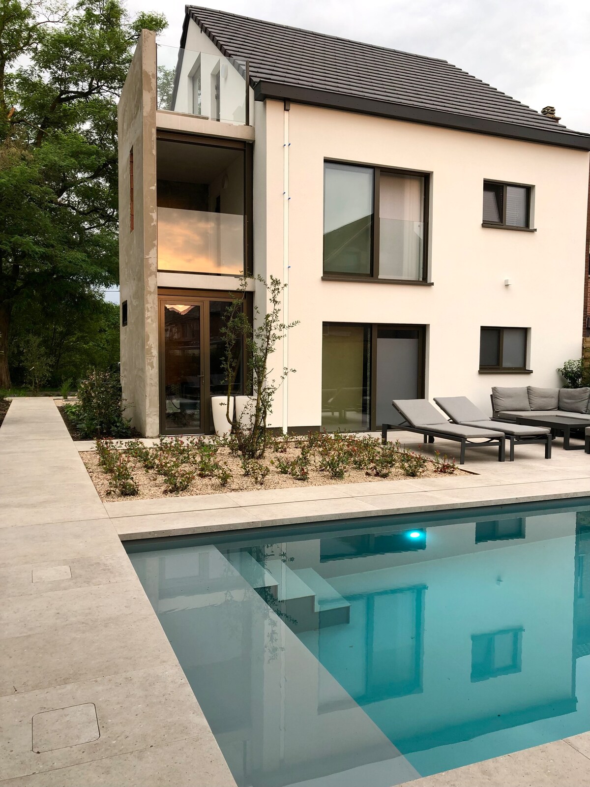 From the balcony terrace, you have a view of the swimming pool in the backyard and a park along the guesthouse. The facade cladding of the terrace is not yet finished, but the terrace can already be used.
