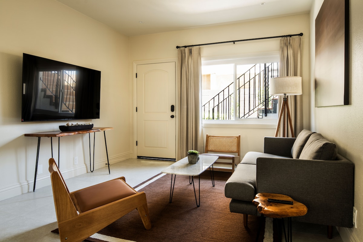 INDOOR LIVING: 3 flat-screen Smart TVs, dinette table, 2-person breakfast bar, laptop-friendly workspace, modern interior decor, hardwood floors