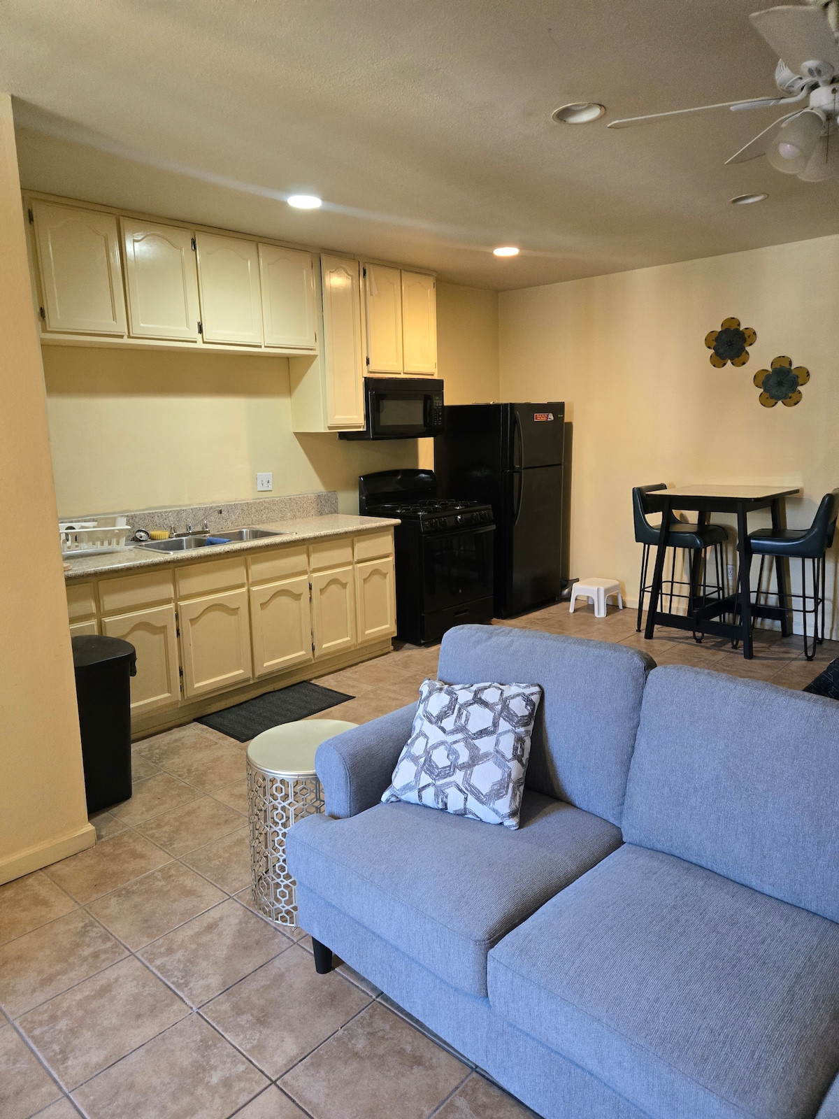 1 bedroom apartment with tile flooring, sofa bed in the living room and kitchen with microwave full size refrigerator toaster oven stove and dishes. Completely functional bathroom with tub and shower head.