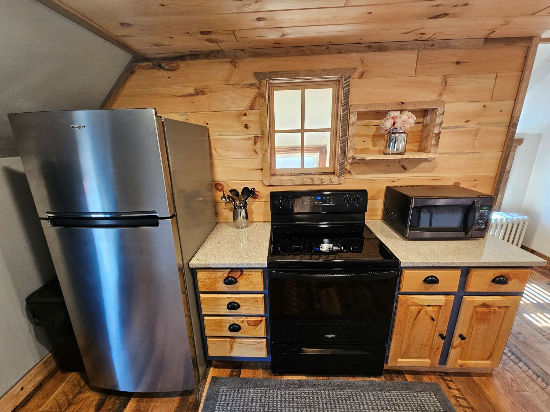Welcome to the Rustic Suite, a lakeside gem on the tranquil shores of the Upper St Croix Lake. This intimate hideaway marries traditional rustic aesthetics with a homely comfort, creating a uniquely cozy ambiance. The suite features a comfortable King bed area, enriched by a warming electric fireplace and TV. Its compact kitchenette, featuring a microwave, fridge, and peninsula seating for two, is perfectly tailored for leisurely mornings or late-night snacks. Refresh in the spacious bathroom, boasting a modern glass shower.