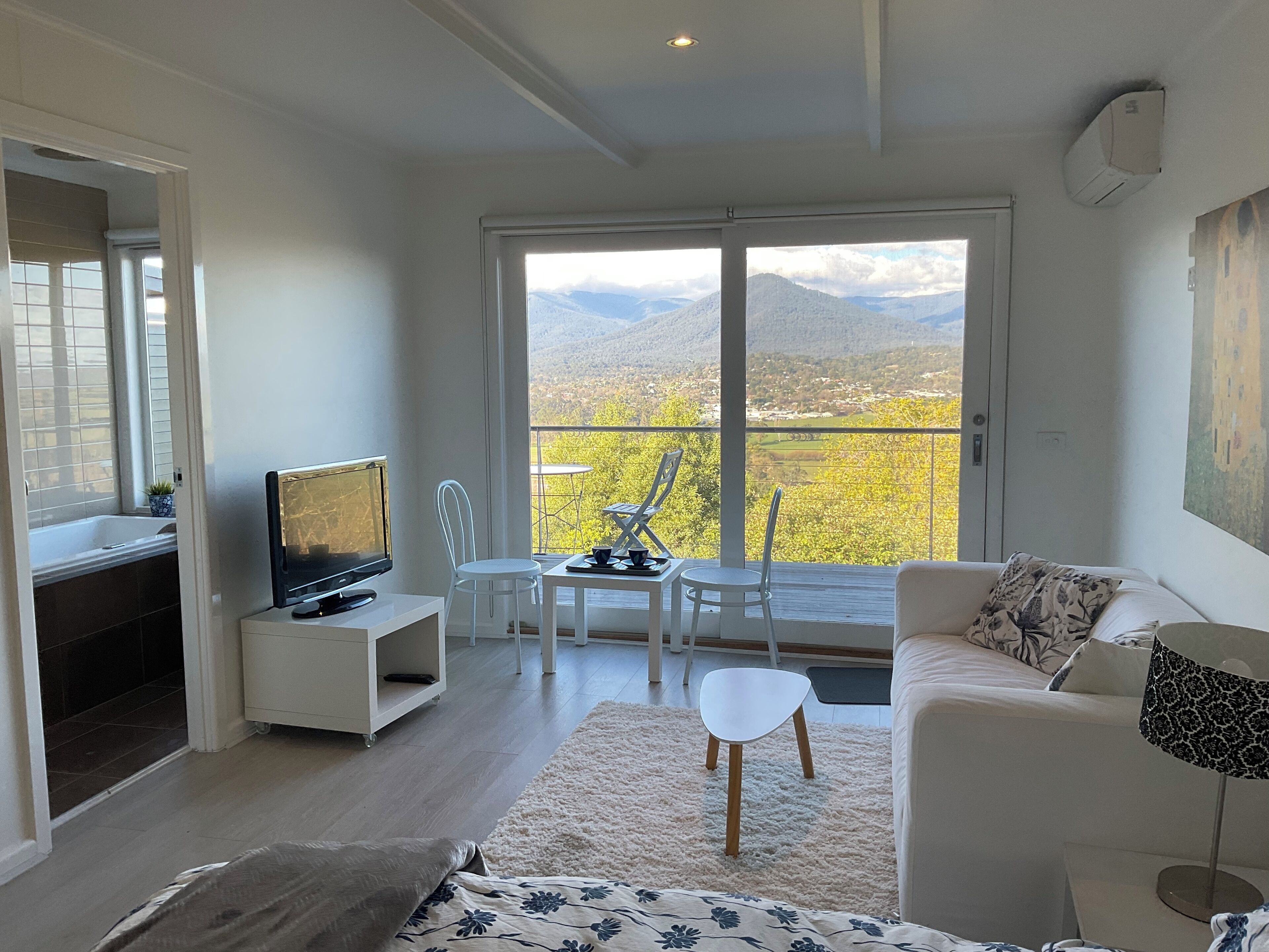 The apartment accommodates two people, with a king-size bedroom, large bathroom with indulgent steam shower for you to relax and unwind, as well as an open plan living, dining, and kitchenette. Enjoy a morning coffee from your own private deck, perfectly positioned to capture the gorgeous mountain views and natural northerly light.