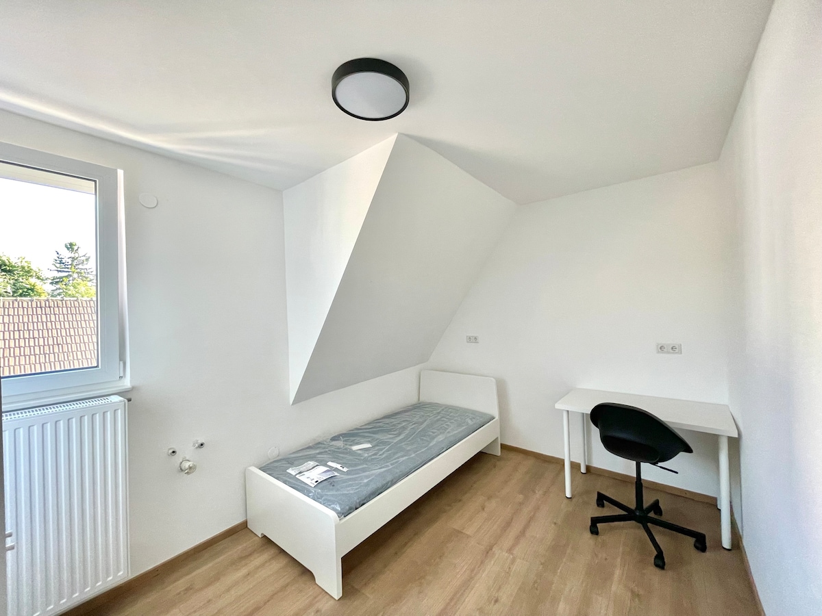 The house offers 11 single rooms. There's a bathroom on each floor. On the ground floor is a large kitchen with fitted kitchen for shared use.