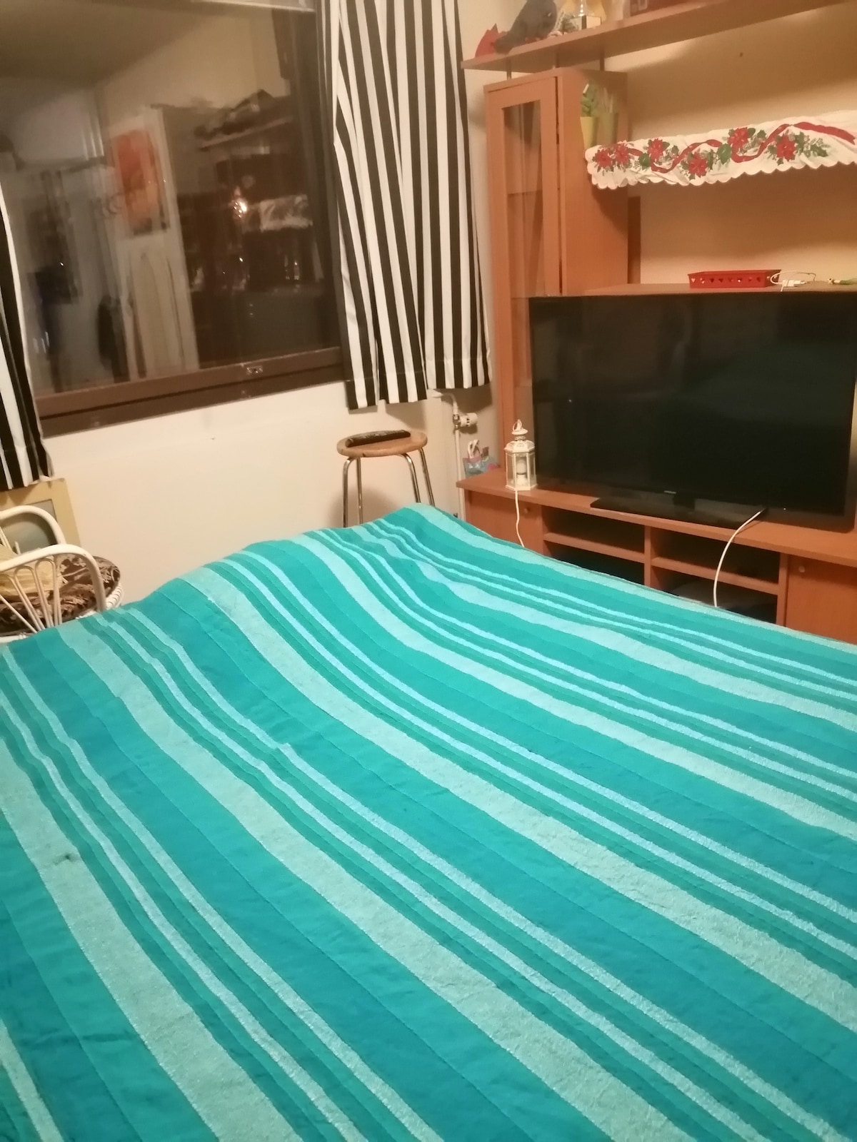 The room has a comfortable single bed, which is spreadable (extended) for two guests as well. Room includes also pillows and a blankets, as well as clean sheets are ready to use. The room also has closet space to hang guests' own clothes and a desk if guests need to e.g. work with computer. Guests will also have clean towels and Wifi is also available.