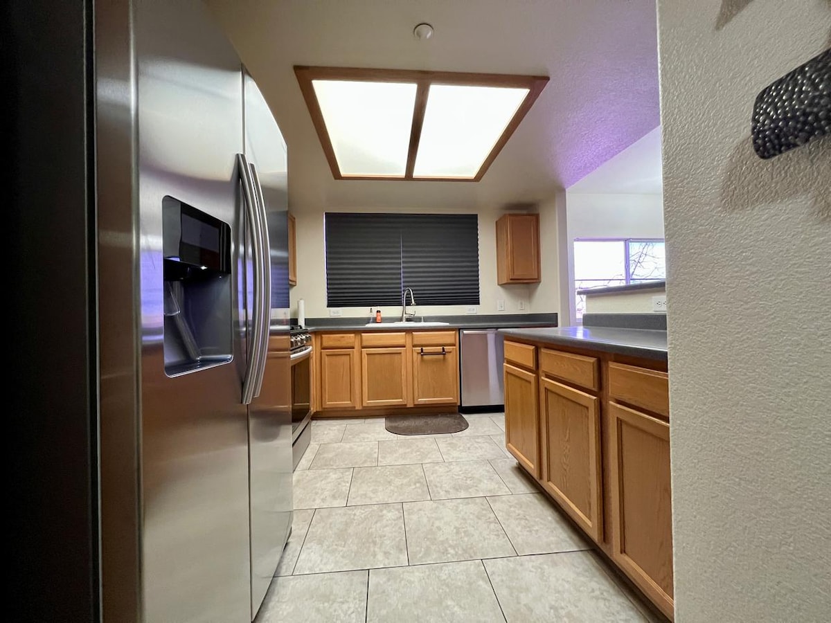 It is equipped with all essential appliances including a refrigerator, dishwasher, stovetop, oven, and microwave.