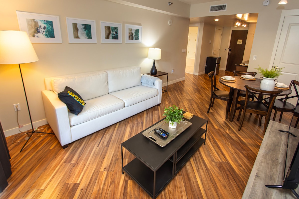 Walking distance to the Village and the Hilton and Westin hotels. Short drive to golf courses and shopping centers. Parking is free and in gated covered structure.