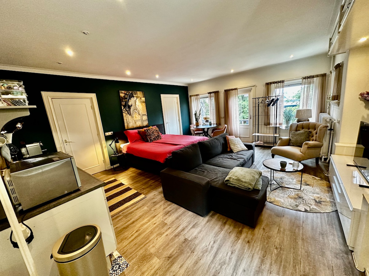 Beautiful spacious apartment with living room and kitchen of 34m2 and a spacious balcony with garden view. The apartment is located on the first floor. You have your own entrance. You have a private bathroom/toilet, which can be reached via the hallway. The stately villa is in the center, yet quietly located. You can park your car for free on our own lot and the villa is within walking distance of the train and bus station.