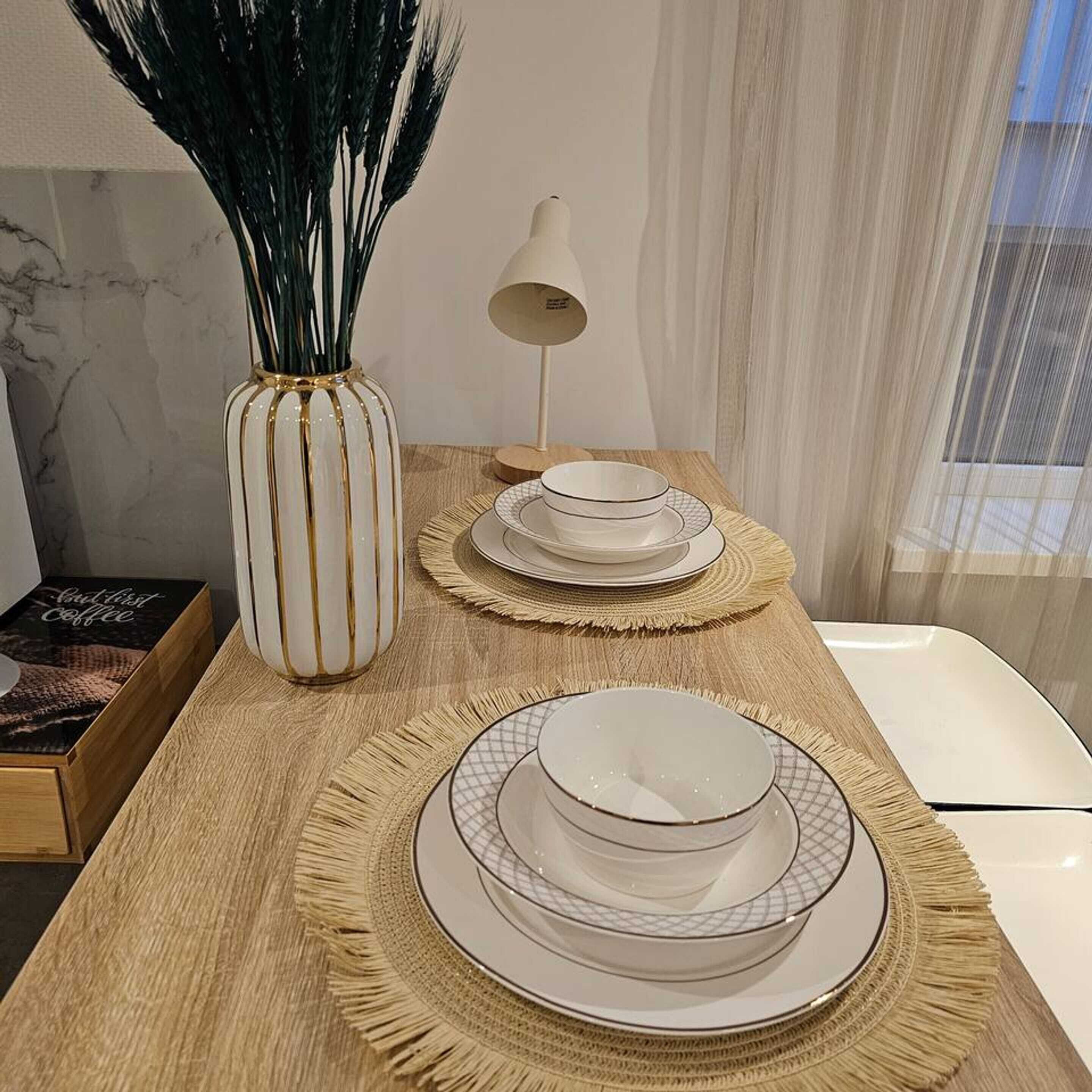 The interior is vibrant and modern, featuring a handy workspace next to the open living area. The well-equipped kitchen allows you to prepare delicious meals to enjoy at the dining table, creating a cozy atmosphere. Internet and air conditioning ensure a comfortable stay.