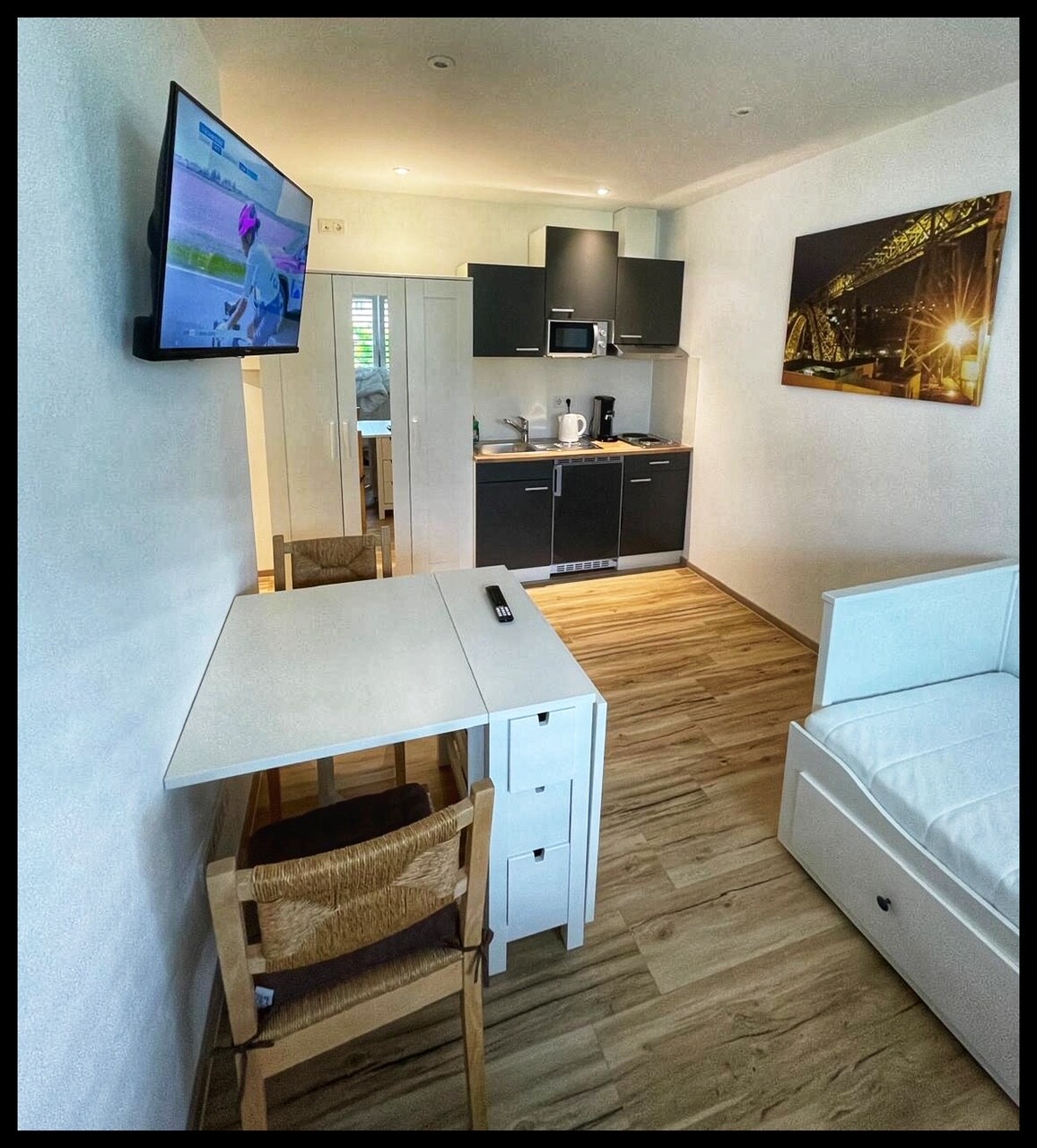 The apartment has a living room with a cozy box spring bed and a sofa bed. So 2 people can stay here.